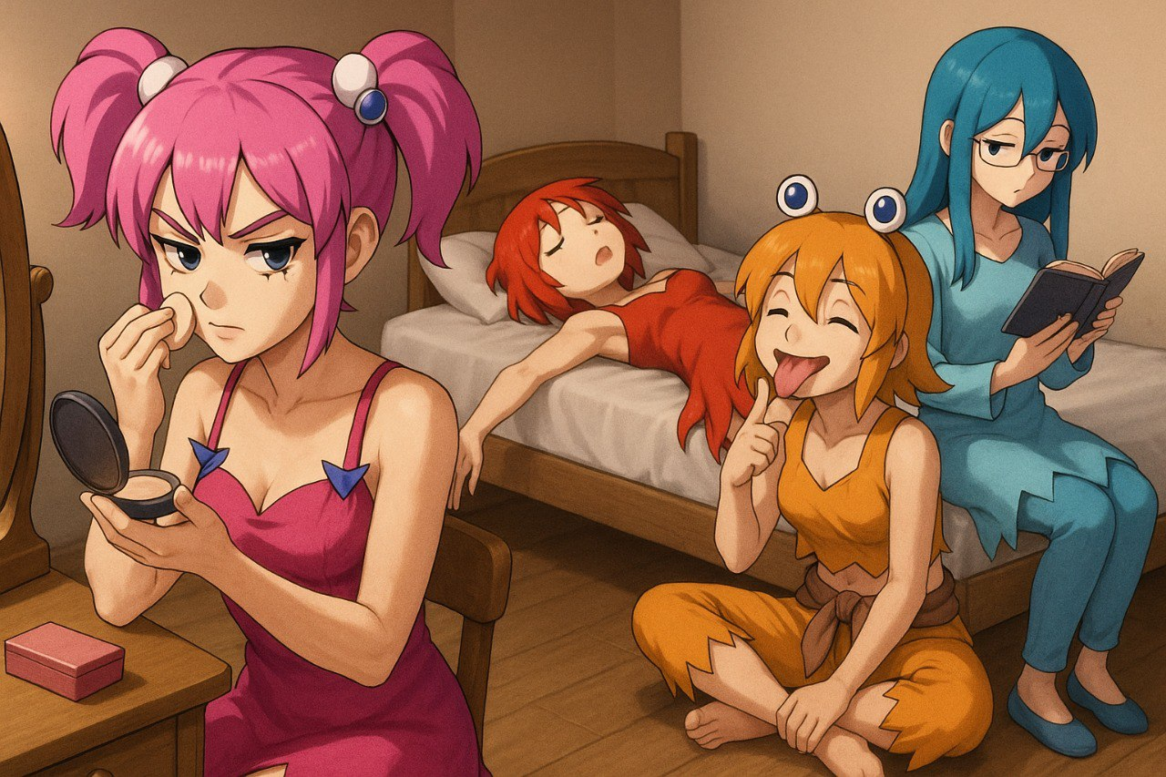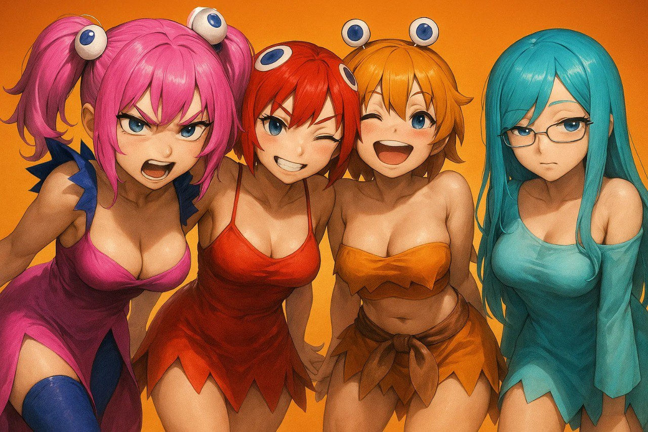 Character Consistency is Crucial: Ensure all appearances, clothing elements (including Inky's spikes and dress neckline, Pinky's pants, Clyde's glasses), hairstyles, colors, and head accessories **perfectly match the descriptions above AND the visual details in the provided reference image.** No details should be missing or altered from the reference designs.