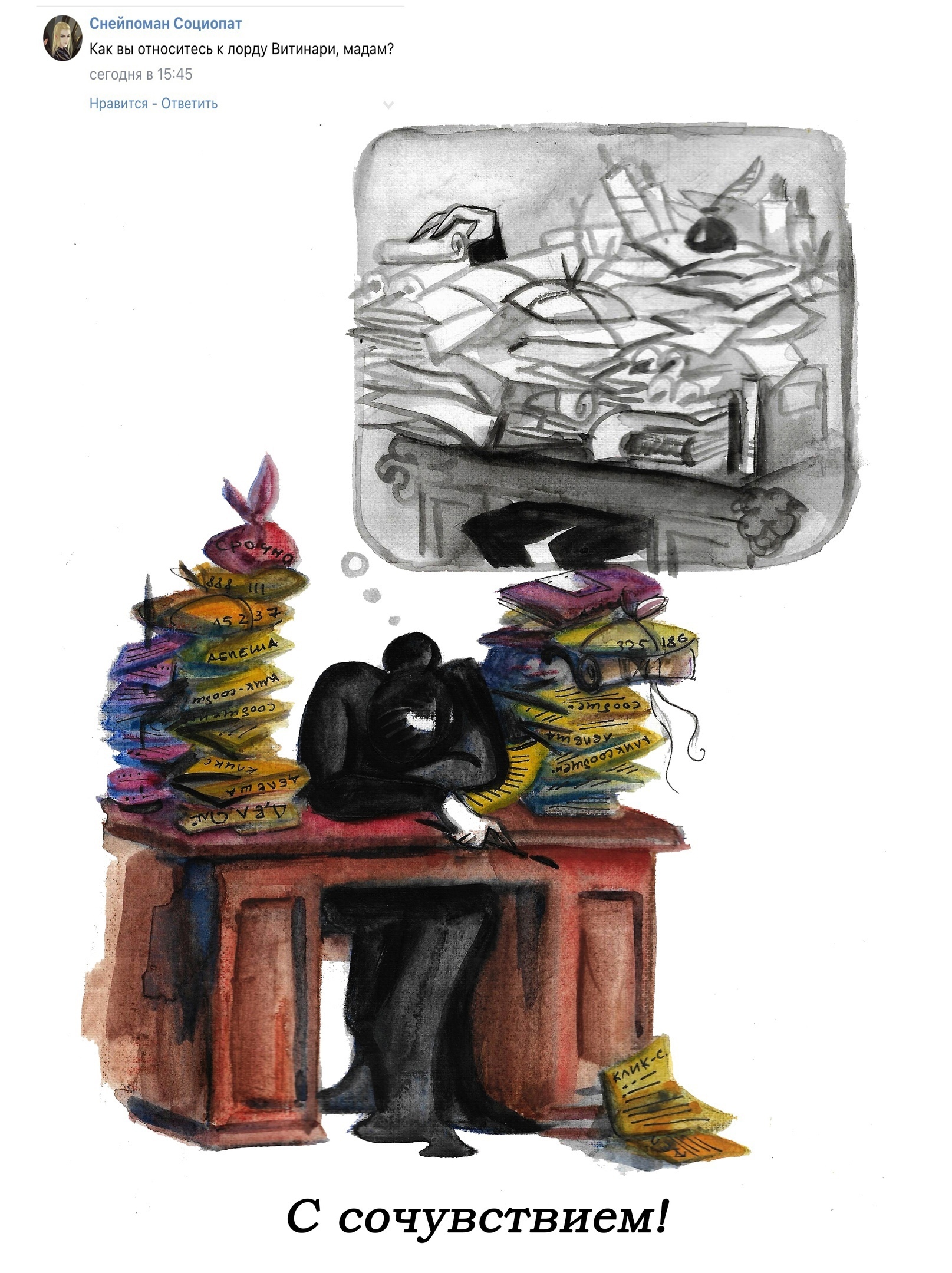 Небольшой арт-пост по Терри нашему Пратчетту от замечательной художницы Алёны Момзовой. Признаюсь честно, меня всегда радует, когда из малюсенькой ассоциации вырастает нечто большое и цельное. Так получилось и с нашей парочкой.