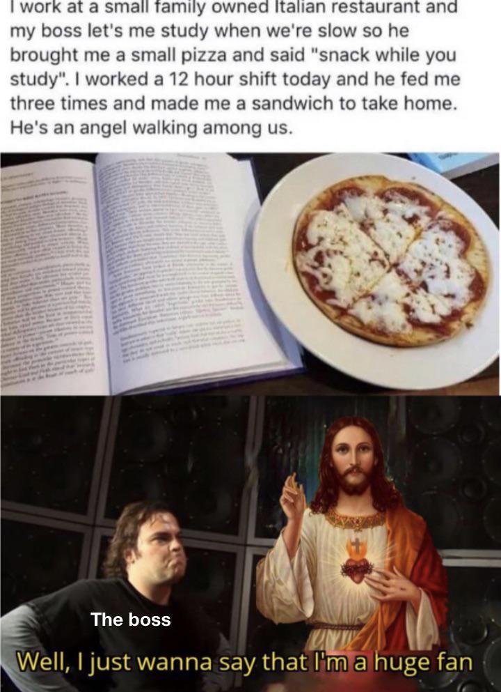 Я работаю в маленьком семейном итальянском ресторанчике и мой начальник позволяет мне учиться пока мало людей, поэтому он принёс мне небольшую пиццу и сказал "перекусывай пока читаешь". Я проработала 12-часовую смену сегодня, и он накормил меня три раза и сделал сэндвич с собой. Он - ангел среди нас.