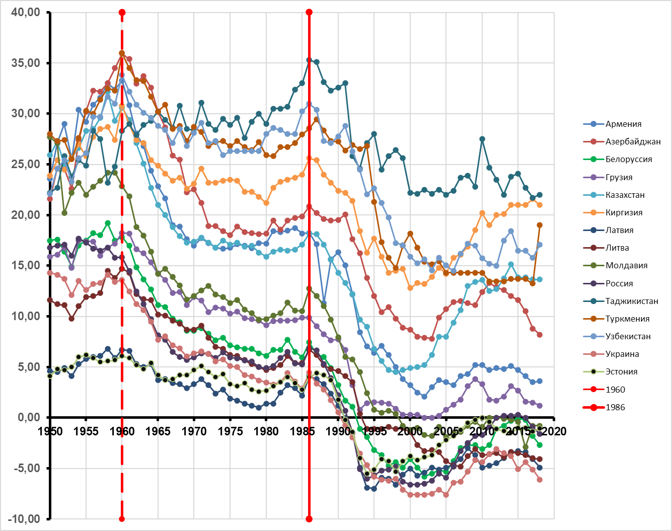 До 1960 года ЕП проявлял тенденцию к росту в большинстве союзных республик. Что же это значило? Не в последнюю очередь на это влияла снижающаяся смертность. Рекордсменом здесь стал Таджикистан, где смертность неуклонно снижается почти все последние года. Да и вообще, экономические потрясения последних 70 лет, как может показаться, на демографию Таджикистана повлияли в меньшей степени, чем на все другие бывшие союзные республики. Еще одно замечание по поводу смертности: в России, как и во всех европейских республиках бывшего СССР, смертность начинает возрастать с начала 1960-х годов.
