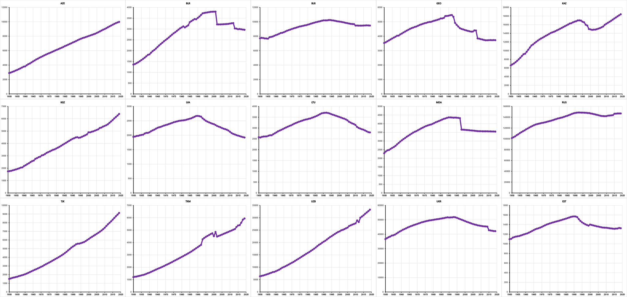 3) Период с1986 по настоящее время - катастрофическое для многих рассматриваемых стран снижение ЕП и его дальнейшая некоторая стабилизация (если можно так выразиться). Даже период застоя, покажется раем для многих и многих тех, кто окажется в начале 90х (а потом в начале 2020х, увы). Ко времени прихода к власти Горбачева и Ко теневой бизнес окреп на столько, что больше не нуждался в партийной крыше. Фактически в СССР к тому времени был реставрирован в полной мере класс крупных буржуа, а вместе с их доходами росли и их аппетиты. Оставалось только одно препятствие - советская надстройка государства. Апофеозом триумфа контрреволюции стало начало 90х, когда проигнорировав волю большинства населения страны, произошёл развал общего государства новым старым классом. Развал стал неизбежным финалом ряда необдуманных (и, может, преднамеренно враждебных) решений в экономике, мертвая хватка которых заставляла события катится как снежный ком, и чьи негативные последствия еще долго будут проявляется, что наглядно видно по графикам ЕП большинства бывших союзных республик.