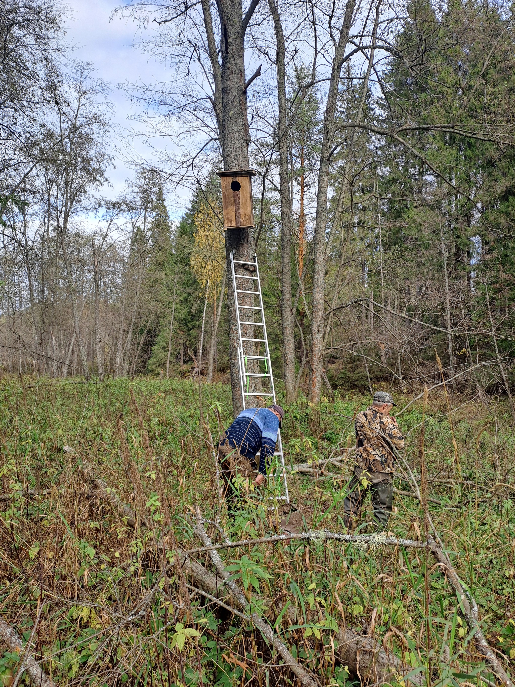И здесь у меня вновь есть пример из личной практики: находил я в них и летяг зимой, и выводок белки летом (сработало, а охота-то закрыта)))), выпугивал сов осенью. Но самым показательным случаем было моё личное участие в развешивании крохалятников (на фото, я за фотографа), и чтобы Вы думали, именно в нашем искусственном гнездовье обнаружено первое в Кировской области "собственно гнездо" большого крохаля, да не одно, а сразу в обоих повешенных крохалятниках. Вот и получается вешали "на удачу", а помогли нашей местной орнитологии. Как знать может быть им пользуются и сейчас?!!!