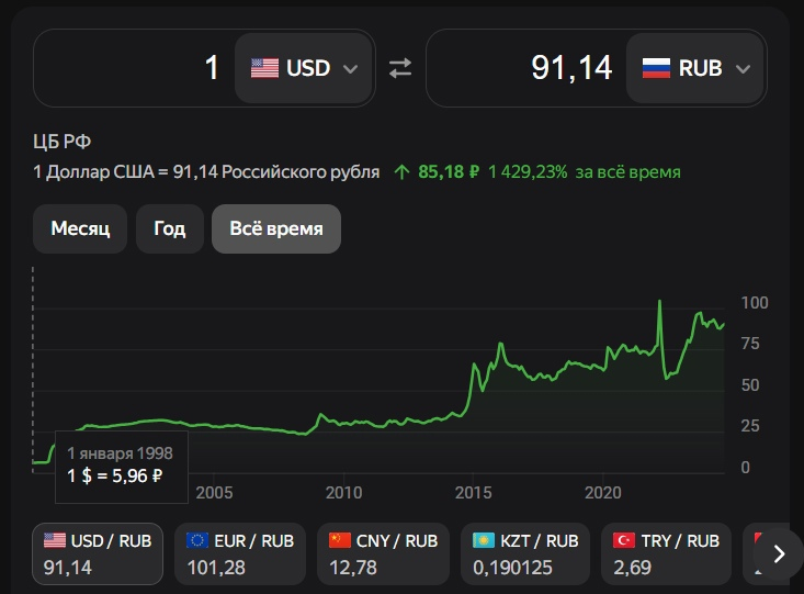 Что даёт информация. Пользуясь Яндексом (картинки) посчитаем каков же рост рубля к доллару с 1998 года 26 лет назад до сего дня рост составил 1429,23%. Разделим 1429,23%/26=54,97% в год. Данная сумма круче всех действующих ставок по вкладам. Предположу, что до 1998г рубль был ещё крепче т.к. в 1998г был дефолт. Из графика видно что был скачок в 1999г и доллар в разы укрепился таким образом ((91,14/27,73)*100)/24=13,69% в год если откинуть скачок и считать с 2000г, что не так позитивно. Темпы роста мировой экономики 5% просто купив доллары и держа их под подушкой можно получать 16,5%, что в 3 раза больше.