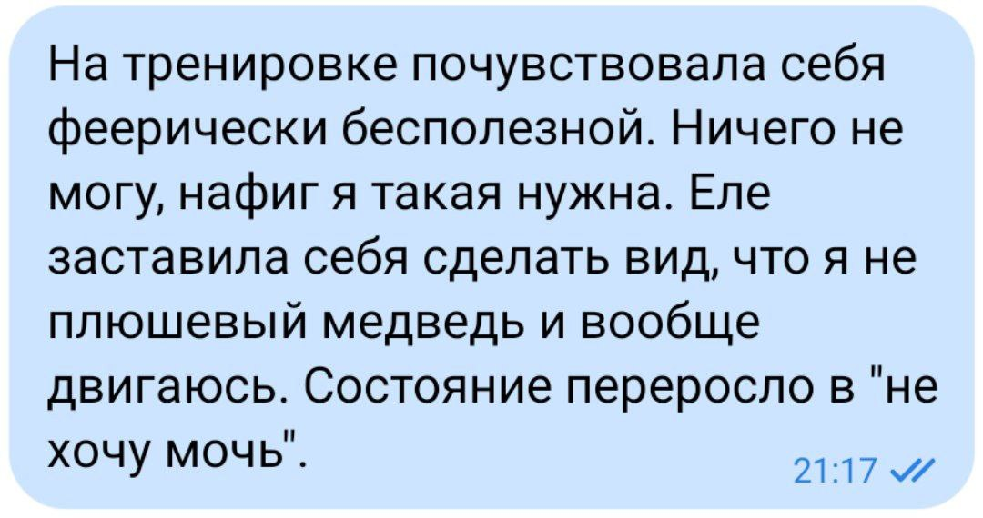 Особенно я ненавидела силовые тренировки. Всей душой. Они мне нравились только на самоизоляции, когда мы с мамой занимались вместе и половину тренировки смеялись над тем, как я, подобно панде, заваливалась на бок, попытавшись перенести вес в планке.