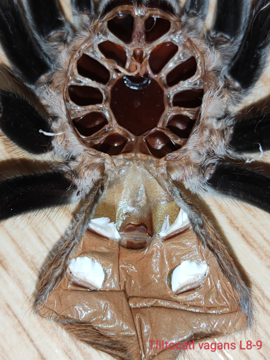 Ключевой признак зрелости — полностью сформированная, потемневшая и затвердевшая сперматека (семяприемник). Её можно увидеть на шкурке паука между лёгкими (белые пятна по бокам).
