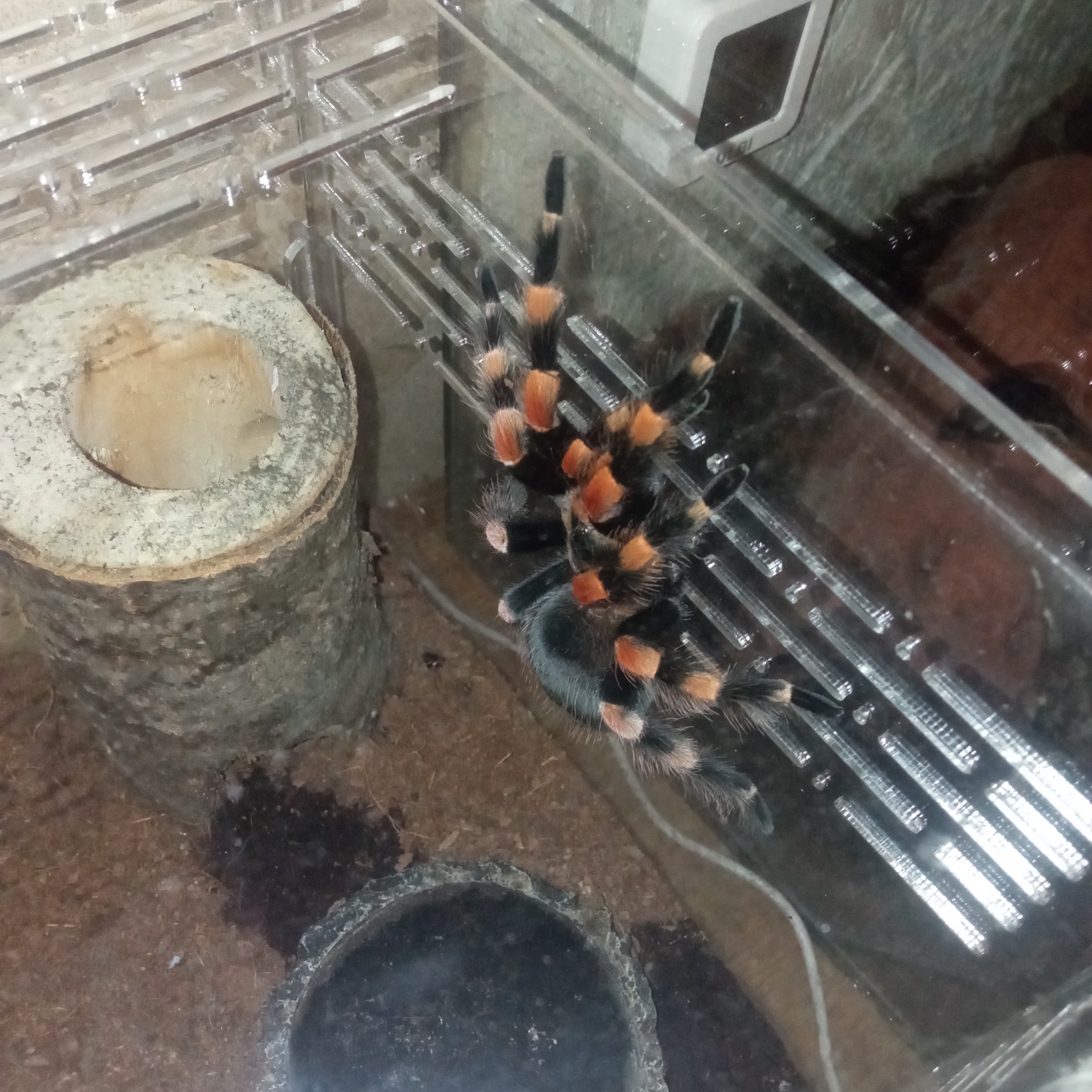 От трусишки Лорки не осталось и следа. При попытке долить воды, птицеед тут же подбегала на звук, как бы спрашивая: «Что это тут происходит?» Когда корм для неё не подходил или она не была голодна, Лора не отходила в сторонку, а поднимала лапы в оборонительной стойке и только потом, убедившись, что чужак не представляет угрозы, отворачивалась. А любое движение в террариуме теперь не проходило без её контроля. Она моментально выходила из состояния отдыха на проверку — кто посмел потревожить её сон?