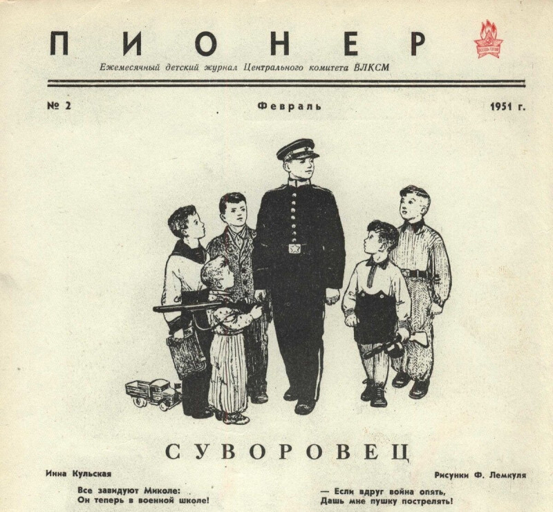 А это - журнал "Пионер", № 2 за 1951 год. На второй странице - иллюстрация Федора Лемкуля к стихотворению Инны Кульской "Суворовец".