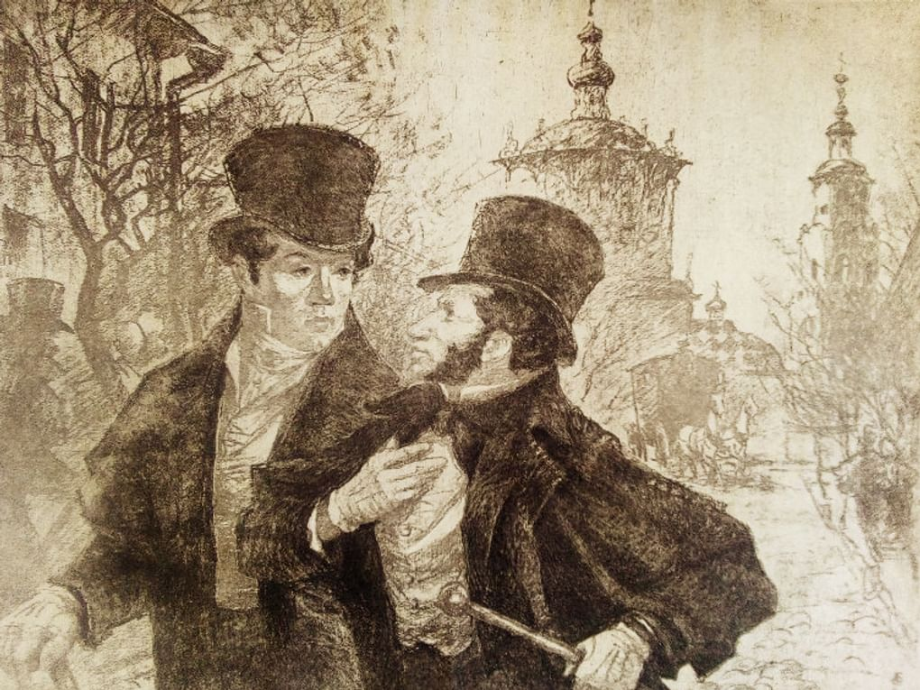 В зале, во всю длину которой был накрыт узкой стол, человек двадцать, разделясь на разные группы, разговаривали между собою. В одном углу с полдюжины студентов Педагогического института толковали о последней лекции профессора словесных наук; в другом — учитель-француз рассуждал с дядькою немцем о трудностях их звания; у окна стоял, оборотясь ко всем спиною, офицер в мундирном сюртуке с чёрным воротником. С первого взгляда можно было подумать, что он смотрел на гуляющих по бульвару; но стоило только заглянуть ему в лицо, чтоб увериться в противном.