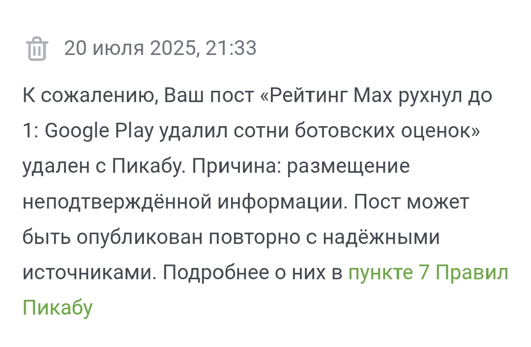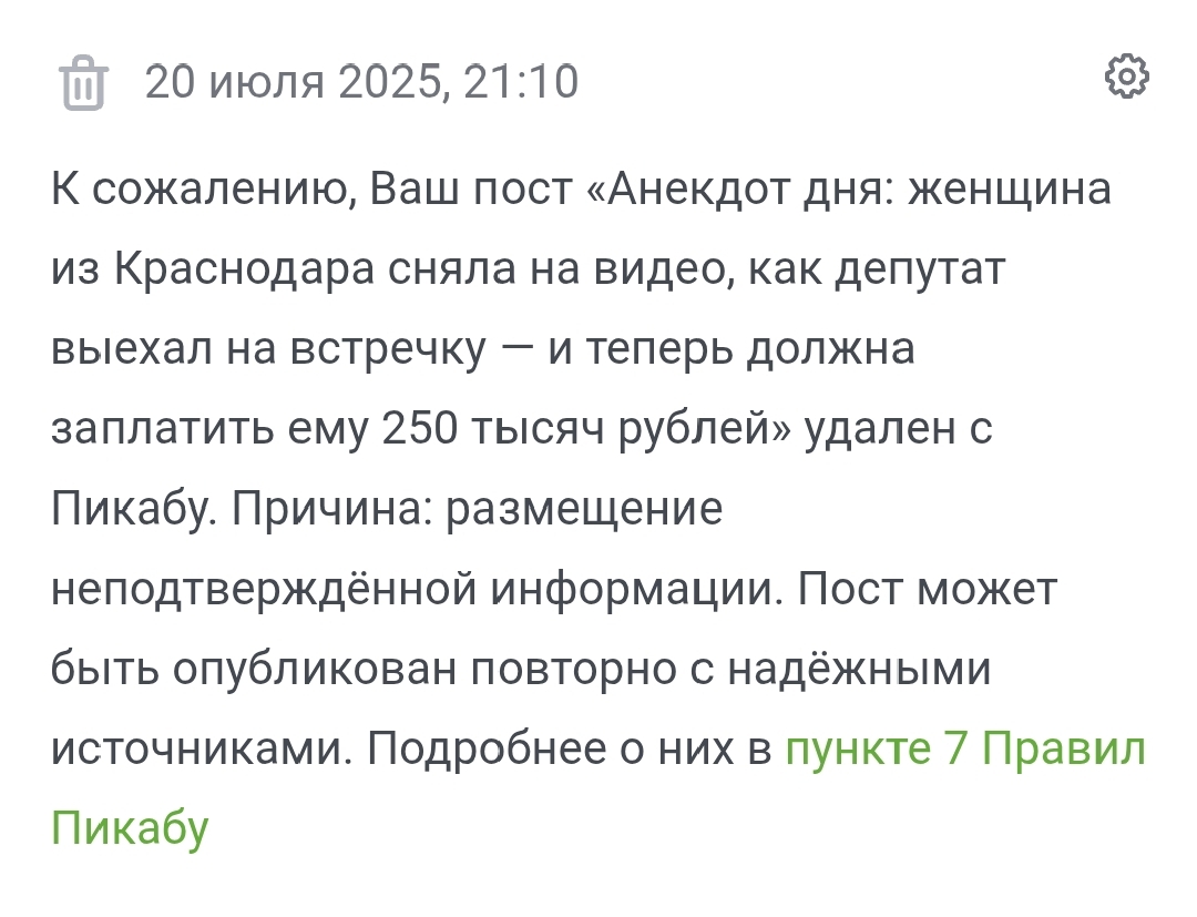 Они кстати, удалили и новость про женщину из Краснодара, которая записала на видео, как депутат нарушает ПДД (гаишники его при этом не остановили) и которой из-за этого влепили штраф в 250 тысяч ₽, якобы это «репутационные потери». А его при этом, всего на 5 тысяч оштрафовали. И снова официальная причина: размещение неподтверждённой информации.