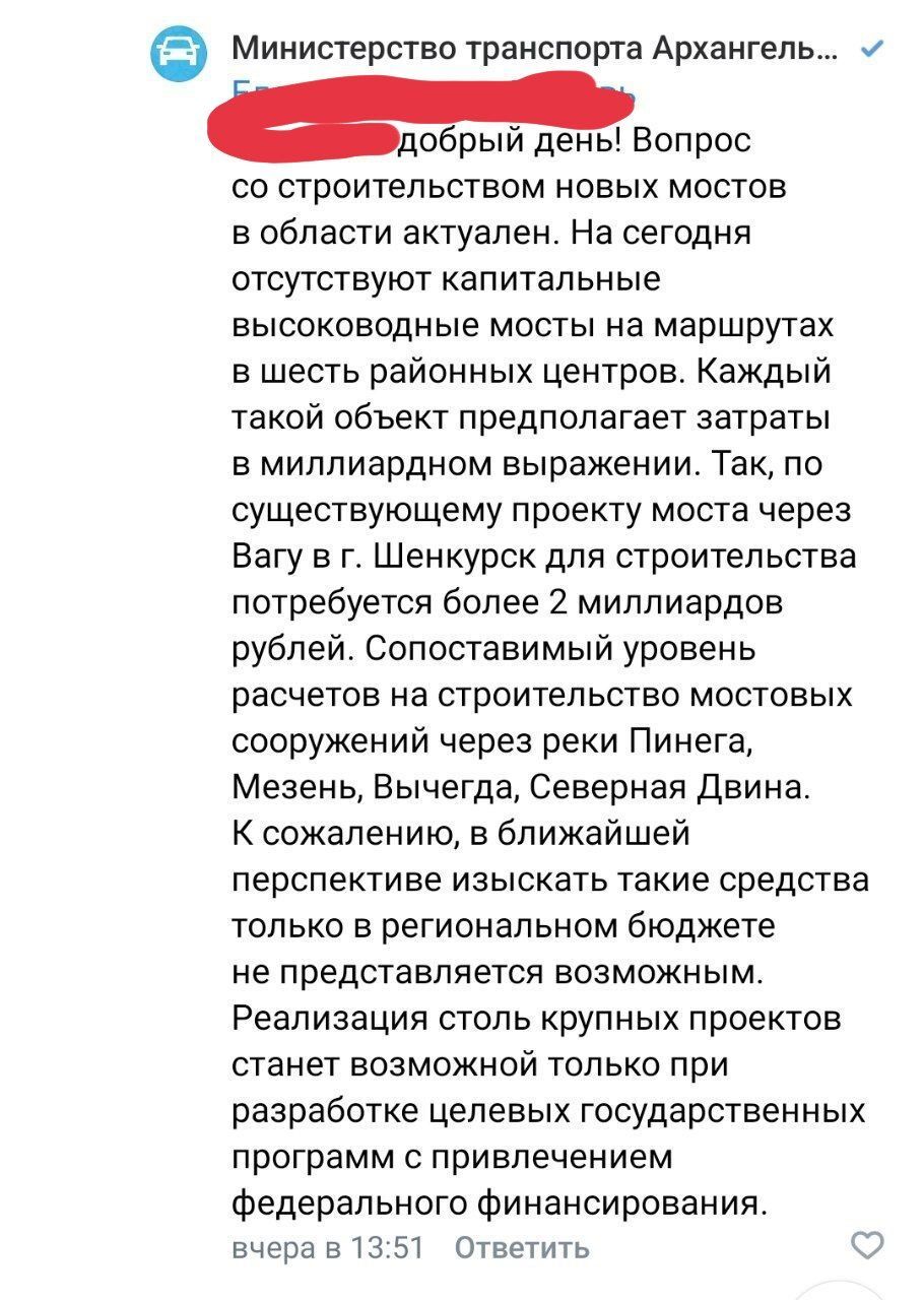 Кроме того, Министерство транспорта Архангельской области неоднократно в ответ на обращения отвечало, что в региональном бюджете нет средств на строительство не только моста в Шенкурск, но и ещё целого списка.