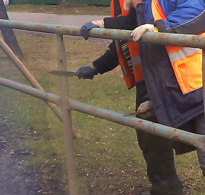 Это ж ножи! Обычные столовые ножи! Я бы понял, если б они счищали металлической щеткой хотя бы... Но ножами - это мощно. Интересно, сколько денег выделили на благоустройство данной улицы? Кому интересно место действия: ул. Декабристов, г. Москва