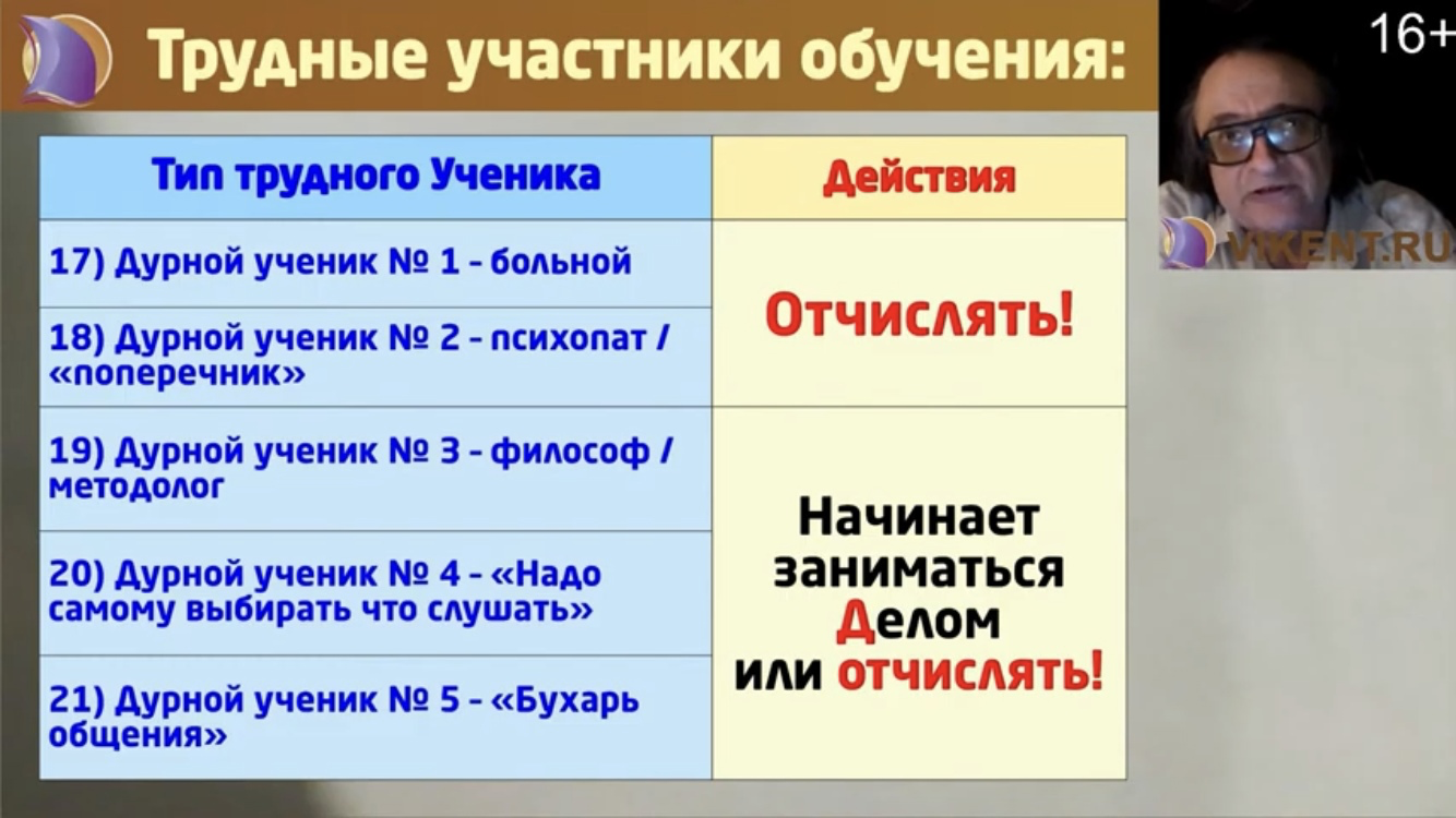 Я занимаюсь обучением всю сознательную жизнь. И могу поделиться лайфхаком: как в аудитории за одну секунду отличить нормального ученика от случайного пассажира? Нормальный ученик придёт с ручкой и блокнотом, а пассажир «всё запомнит». С нормальными учениками можно и нужно работать, а пассажиров лучше сразу гнать поганой метлой.