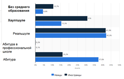 Тут очень зависит от того, где и какая школа. Например, маленькие деревенские школы почти полностью немецкие, а иностранцы обычно там полностью "онемечены". В городах их куда больше, особенно в социальных районах. В хауптшуле бывают классы, где хорошо, если один немец наберется. Там обычно еще и специальные интеграционные классы имеются. А вот в своей гимназии я была вообще единственной, кто не говорил на немецком как на родном.