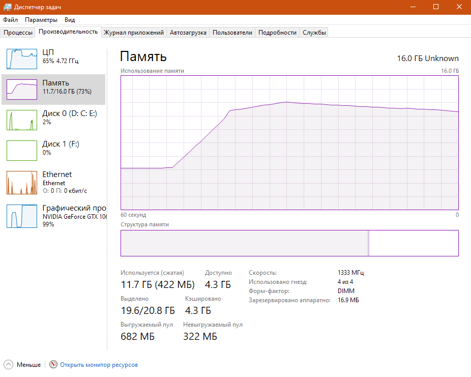 Проблема в том, что при работе с графикой этот принцип почему-то не работает. Перед загрузкой данных в видеопамять Windows нужно сначала загрузить их в оперативку, и для этого она может использовать только тот "по-настоящему свободный" остаток памяти, что на рисунке я обозначил "доступно". Кэшированные (зарезервированные) данные почему-то не затираются, а должны быть предварительно сброшены в файл подкачки (если вдруг кто-нибудь в комментариях объяснит мне, почему, буду рад). Соответственно, если у вас не используется файл подкачки (а я при своих 16 гигах оперативки так и сделал), объём используемой видеопамяти будет ограничен только "свободной" (в понимании винды) оперативкой. Иногда этот объём может падать практически до нуля. Например, сейчас, когда я пишу этот пост, у меня там всего лишь 180 Мб)