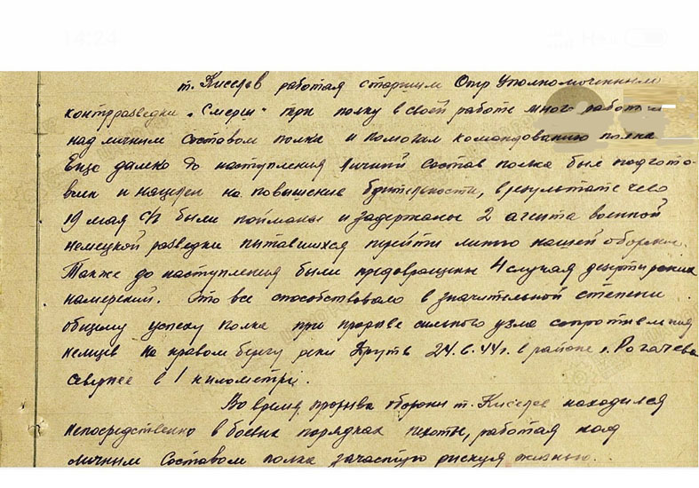 « т. Киселёв, работая старшим Оперуполномоченным контрразведки «СМЕРШ» при полку, в своей работе много работал над личным составом полка и помогал командованию полка.