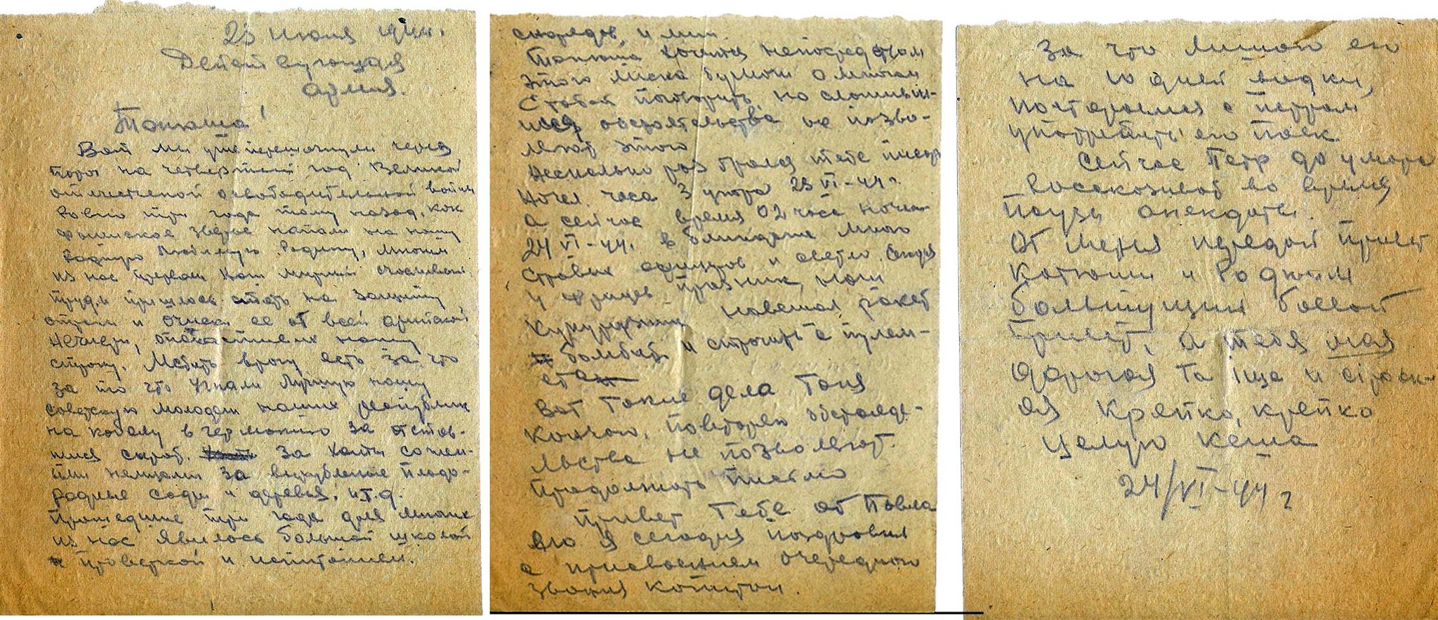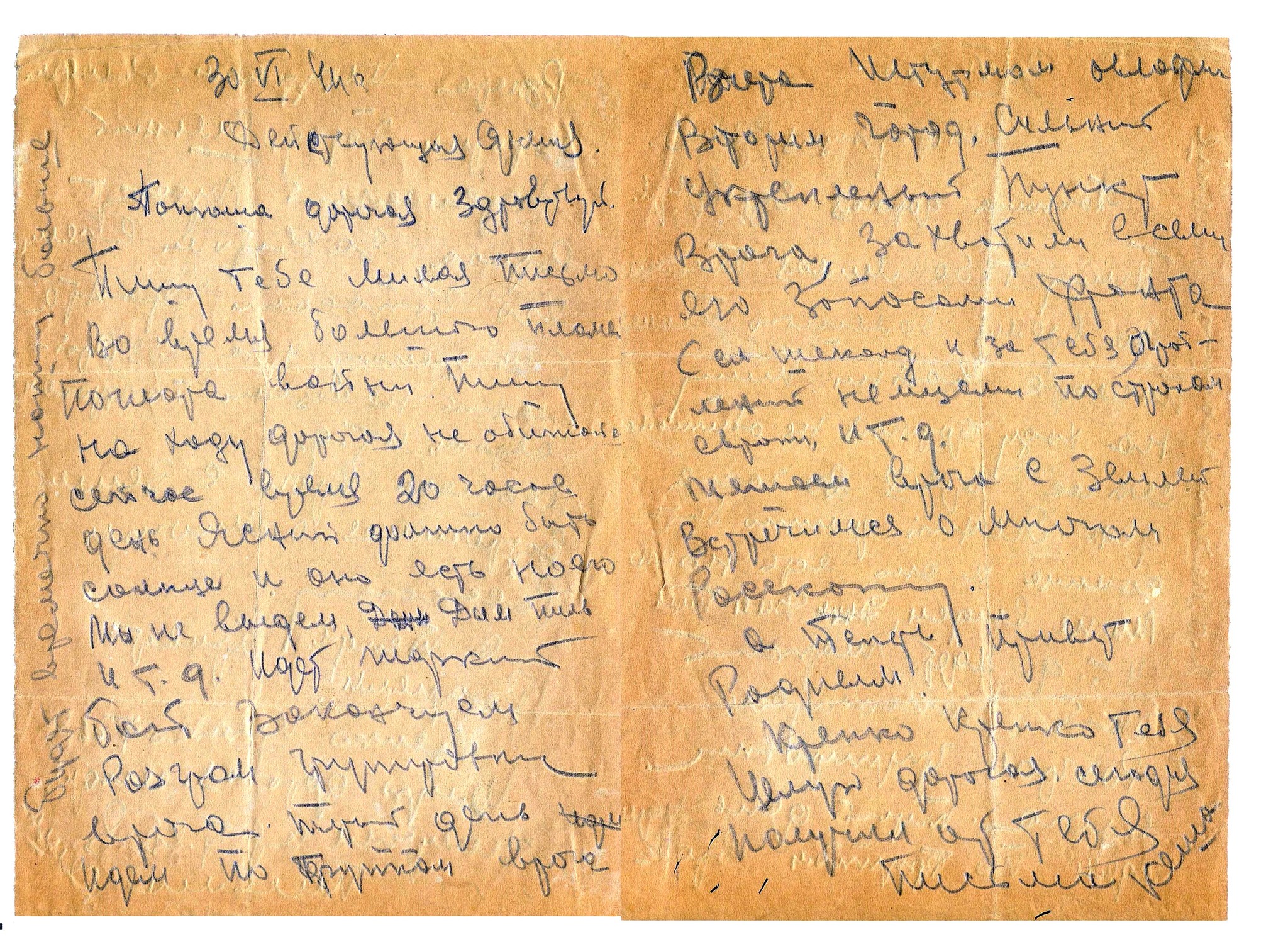 Несколько раз брался тебе писать ночью, часа в 3 утра 23 VII- 44г, и, сейчас, в 2 часа ночи 24го VII 44г , в блиндаже, где много строевых офицеров. Светло. Сегодня у фрицев "ПРАЗДНИК", наш кукурузник навешал ракет, бомбит и строчит из пулемета.