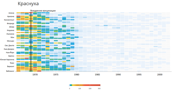 Приведённые «тепловые карты» показывают число заболевших некоторыми опасными инфекционными заболеваниями в год на сто тысяч человек по каждому из 50 штатов (плюс Округ Колумбия) за несколько десятков лет. Вертикальной чертой отмечен год введения вакцинации.