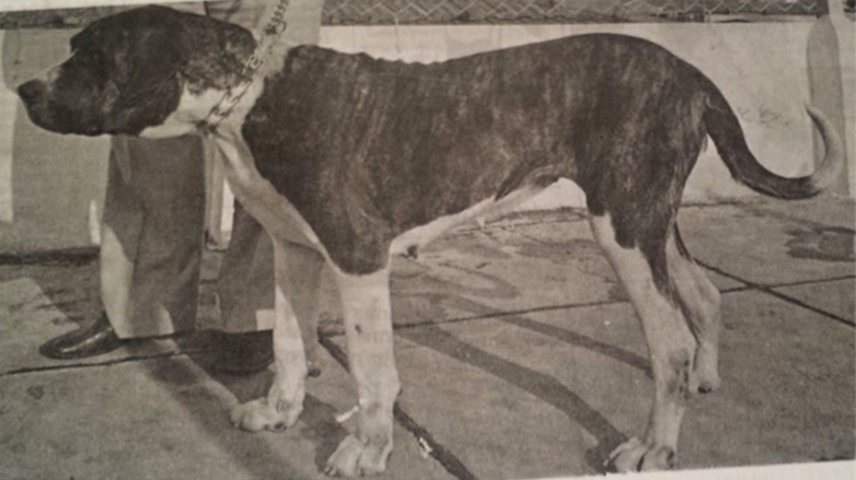 Собака, сфотографированная на специализированной выставке породы фила бразилейров 1960-х годах Источник: "Большая книга о фила бразилейро", de Procópio do Vale.