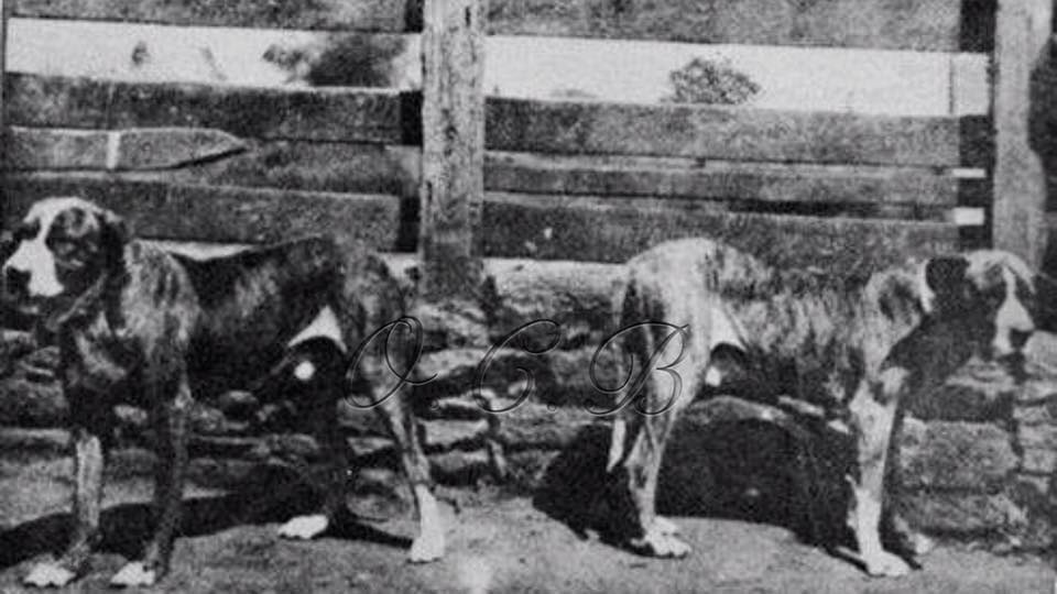 Неизвестные фила бразилейро, фото 1910 года. Я не слишком люблю использовать в постах фото без достоверных кличек животных, но в порядке исключения опубликую это фото тут. В первую очередь из-за силуэта правой собаки: у неё слабо выраженная холка, которая находится ниже крупа. Если простым языком - собака явно высокозада, что характерно для современных фила бразилейро.