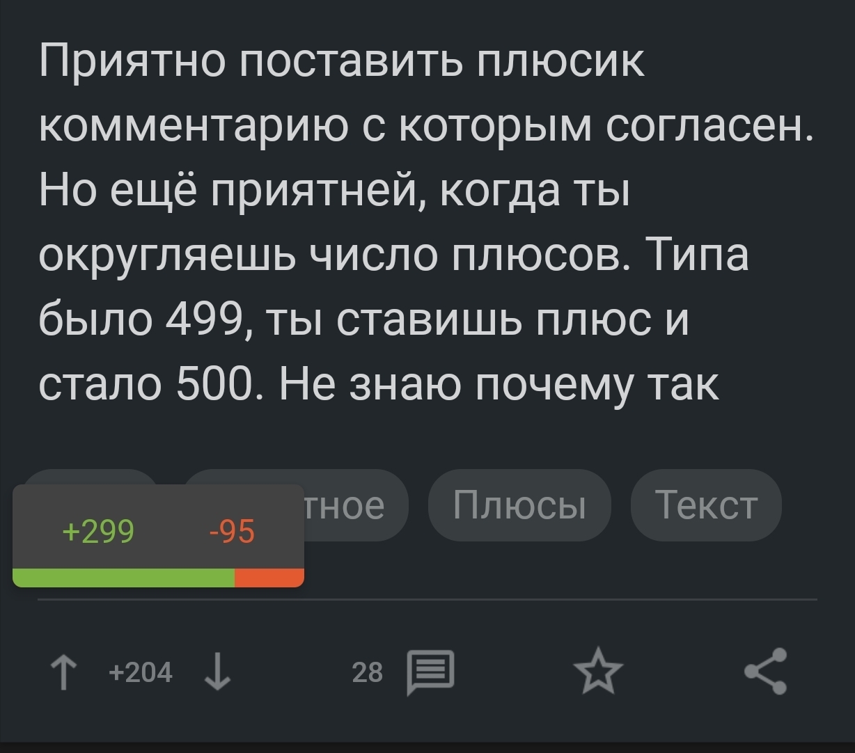 Приятно поставить плюсик комментарию с которым согласен. Но ещё приятней, когда ты округляешь число плюсов. Типа было 499, ты ставишь плюс и стало 500. Не знаю почему так