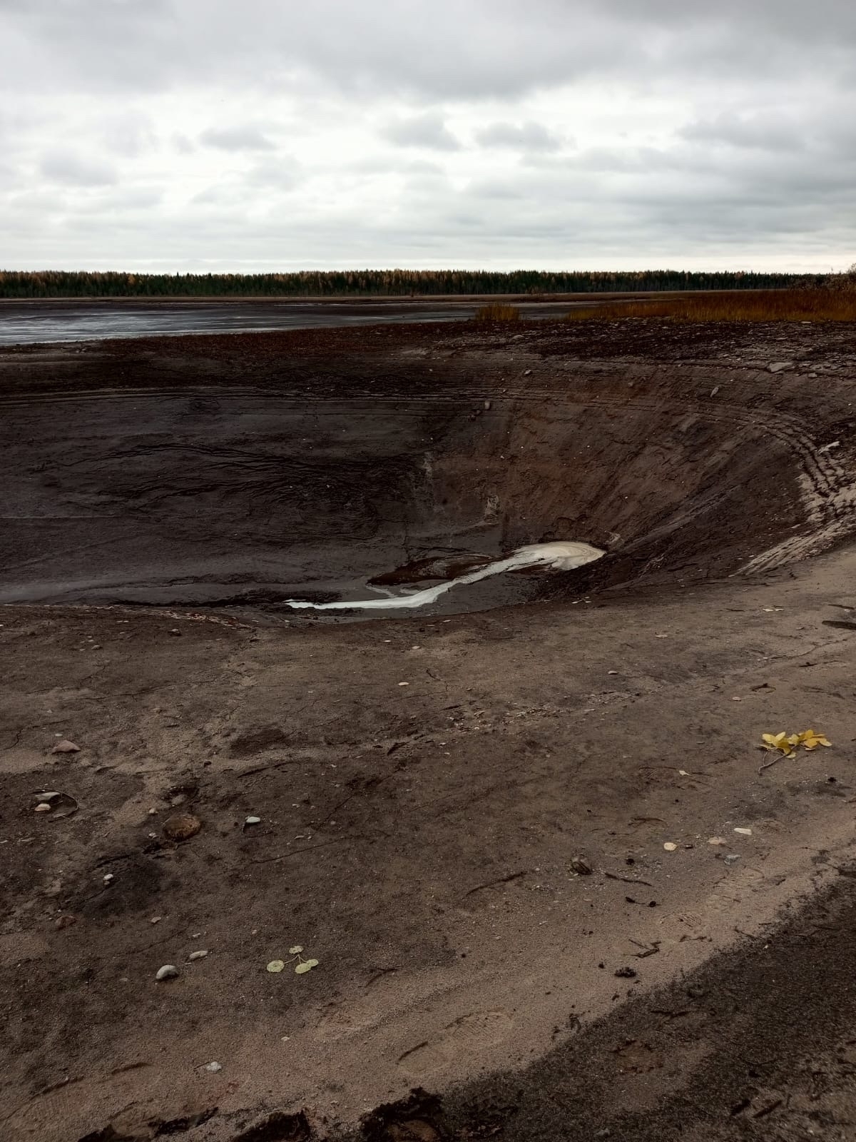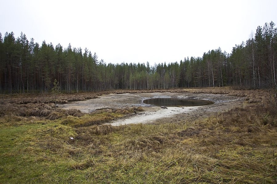 Озеро рядом с поселком Река Емца Плесецкого района. С детства слышал легенды, что иногда вся вода из озера уходит, но так никогда этого не видел. Но все дети знали, где в дне дырка, летом мы плавали на плоту и пятиметровой жердью находили место, где жердь ныряла глубоко и полностью скрывалась под водой, а через какое-то время всплывала, причем в любом другом месте глубина озера не превышала 1-2-х метров. За последние лет 50 в озере тонуло немало людей, но часто тел так и не находили. И многие годы я думал, что это только легенды, пока не увидел сам в октябре 2010 года. Именно тогда и была сделана фотка с лужицей посередине.