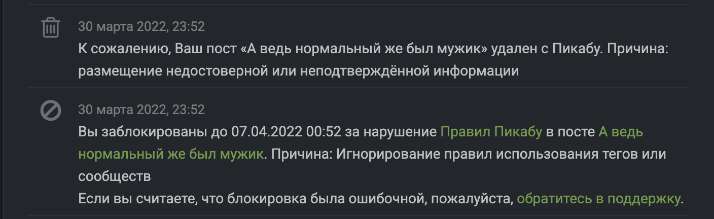 Недавно мой пост удалили, как "недостоверный" а меня забанили на 10 дней.