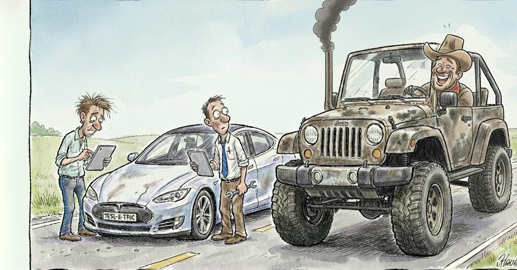 Бензин у него, между прочим, заканчивается. Дороги разбиты. Воздух отравлен. И пассажиры в салоне всё чаще на электромобиль поглядывают. Тот самый, который «не работает».