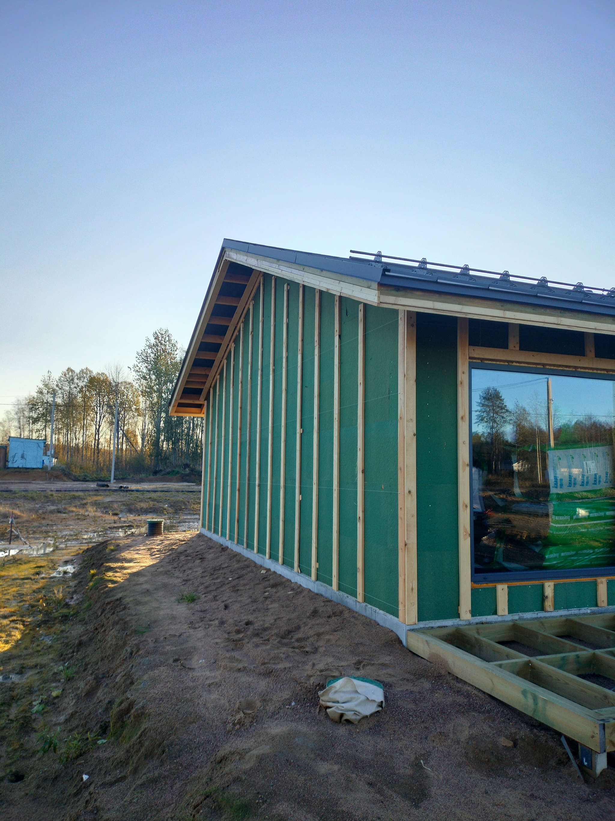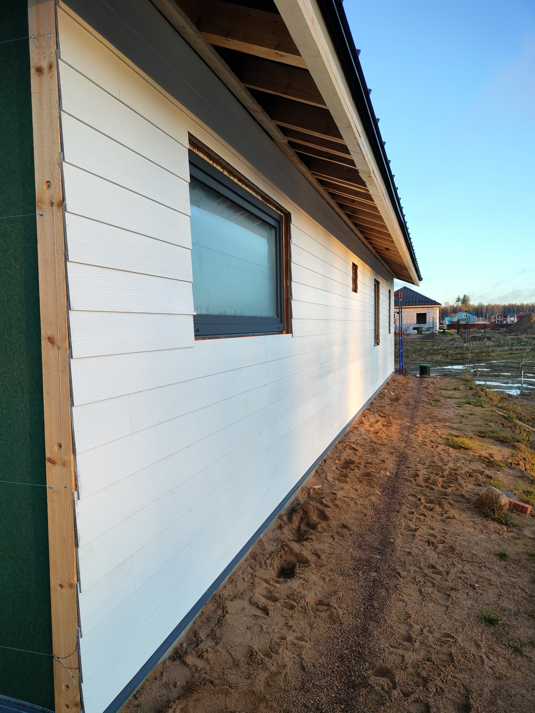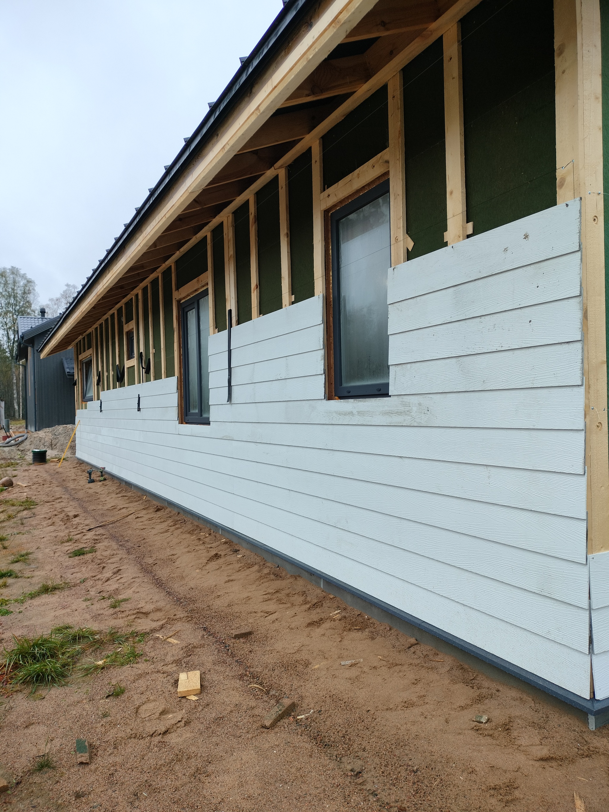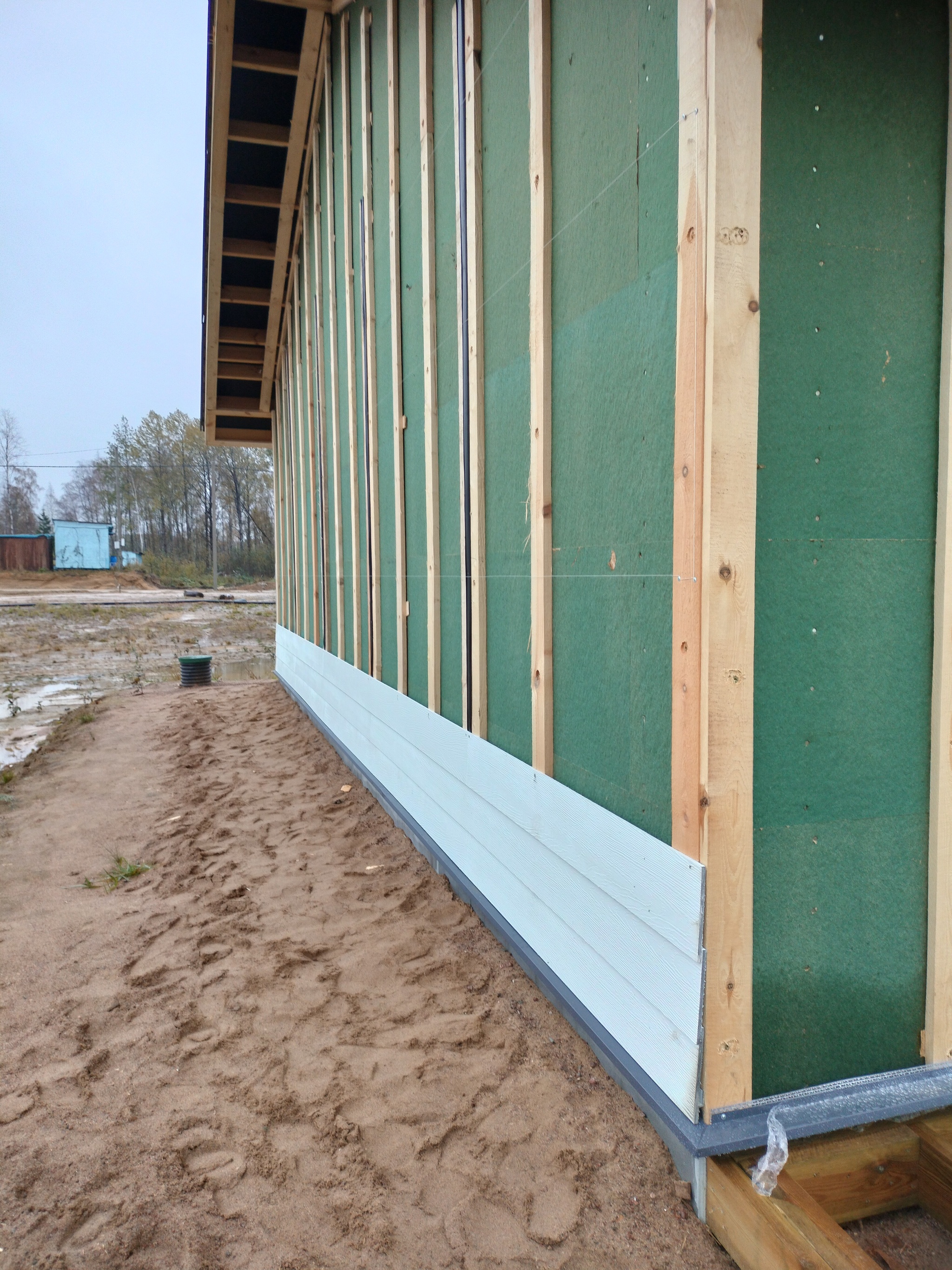 Смонтировал сетку от грызунов, отбил ноль, смонтировал отливы, стартовую и начал монтировать панели. Также добавил соединители.