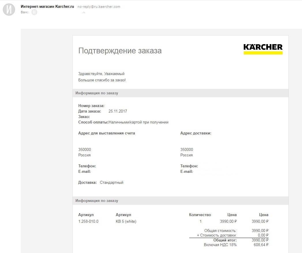 Раза 2 или 3 уже покупал продукцию компании Karcher, но всегда это было в фирменных магазинах и вопросов ни по покупке, ни по обслуживанию не было. Тут решил сделать заказ через интернет-магазин. Условия устроили, доставка в мой город в течение одного рабочего дня да ещё и бесплатная, учитывая сумму покупки. Заказ был сделан в субботу 25.11.2017.
