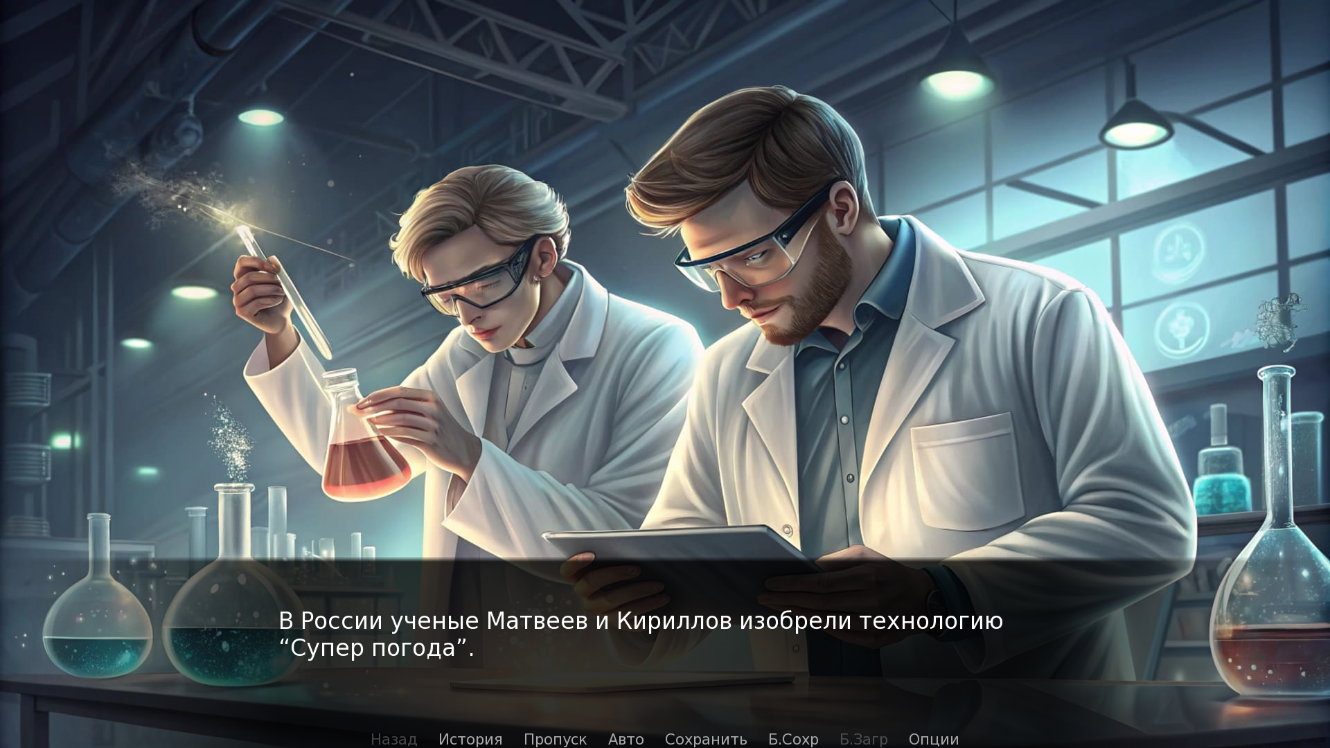 * Учёные изобретают технологию “Супер погода” это нанопорошок, который распыляют в атмосфере при определённой концентрации локально удаётся, менять тип погоды. Бездумное использование технологии привели к чрезмерной концентрации нанопорошка в атмосфере.