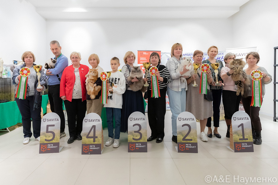 В качестве иллюстрации - Best of Best с нашей последней выставки: слева направо тайская кошка, курильский бобтейл, сибиряк, британец и норвежская лесная: