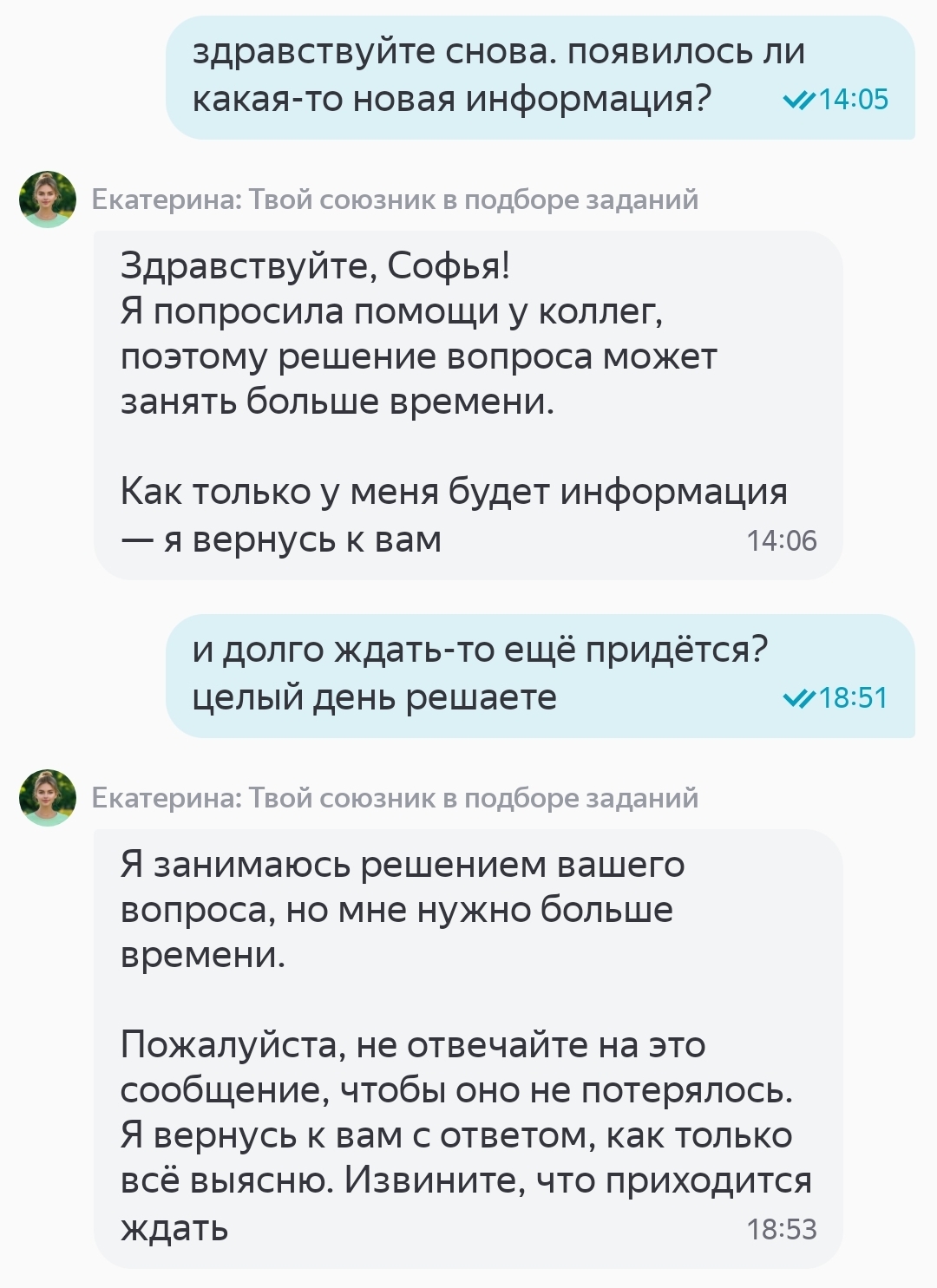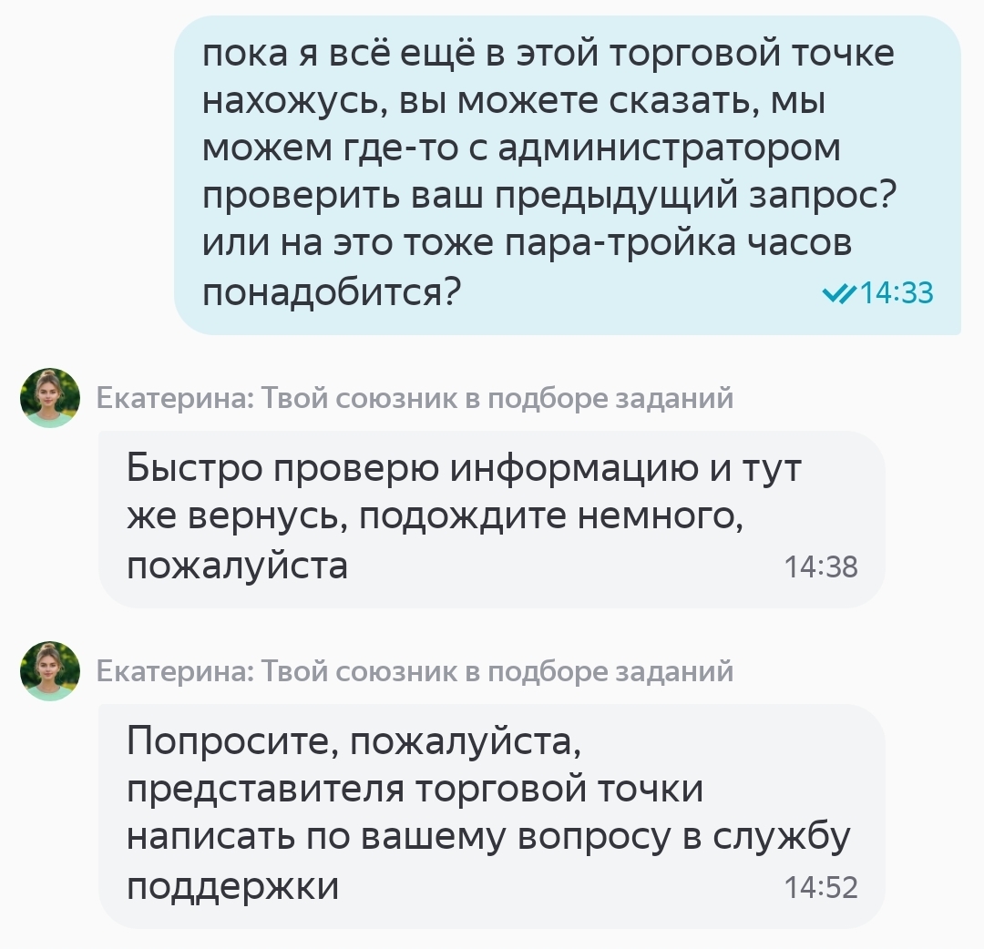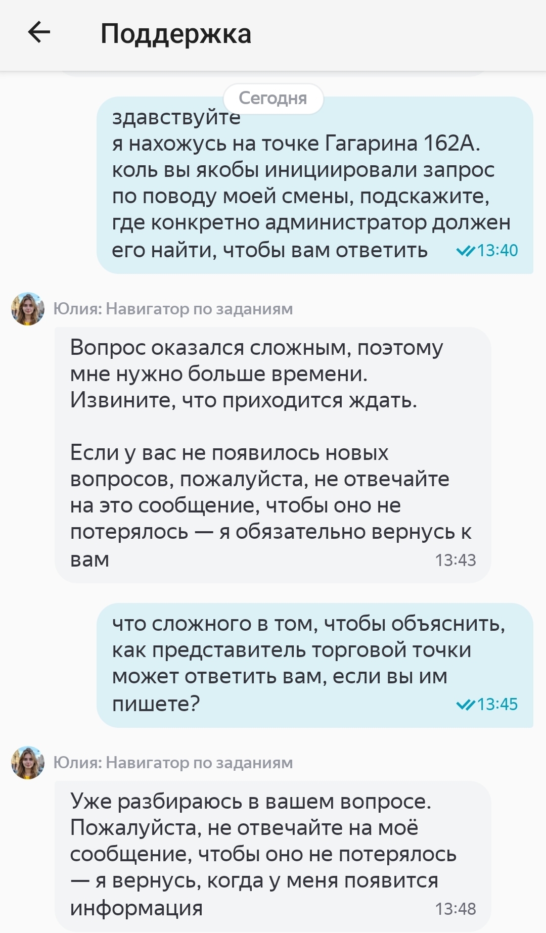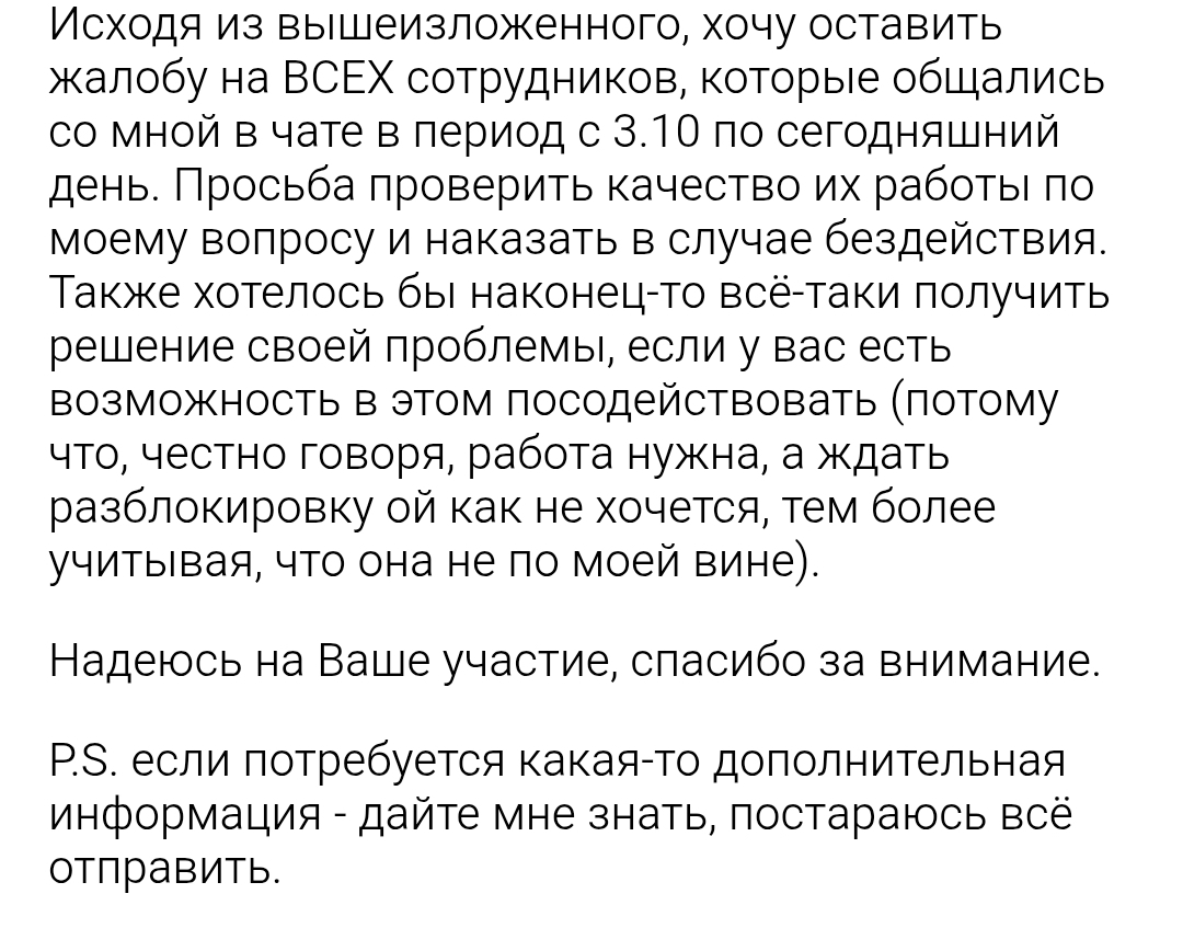 Это не какая-то страшная ситуация, я читала здесь истории и похуже. Но, во-первых возможно, моя ситуация сможет чему-то научить (хотя хз чему, но всë же); во-вторых, мне искренне хочется, чтобы Яндекс Смена увидела, насколько бездарные сотрудники работают у них с клиентами; в-третьих, если они наконец-то сделают ХОТЬ ЧТО-ТО, это будет огромная победа для меня; в-четвëртых, от себя добавлю, что сейчас лично мне деньги сейчас нужны (а кому, собственно, нет?), и отказываться от работы из-за блокировки, в которой я даже не виновата, мне не хочется.