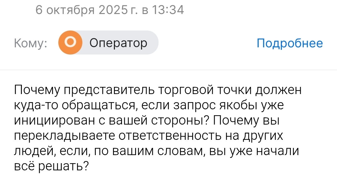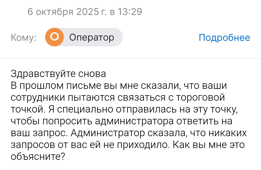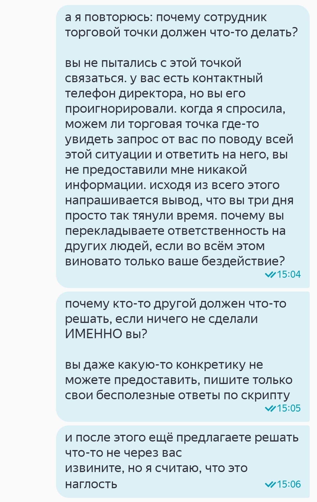 Не долго думая, я решила доехать до неë и попросить администратора ответить на запрос от Яндекса и наконец-то закончить эту невероятную эпопею. Довольно наивное предположение, однако. Администратор сказала мне, что никаких запросов касательно меня от Яндекса ей не приходило. Хотя поддержка клялась и божилась мне, что они работают над моей проблемой. Я снова решила написать им на почту, чтобы узнать, а какого, собственно, х... Ничего вразумительного не узнала. В какой-то момент я подумала, может, мы с директором магазина чего-то не понимаем, и нам смогут подсказать, куда нужно нажать, чтобы попробовать найти их первоначальный запрос. Отклик не удалось получить даже на такую элементарную просьбу.