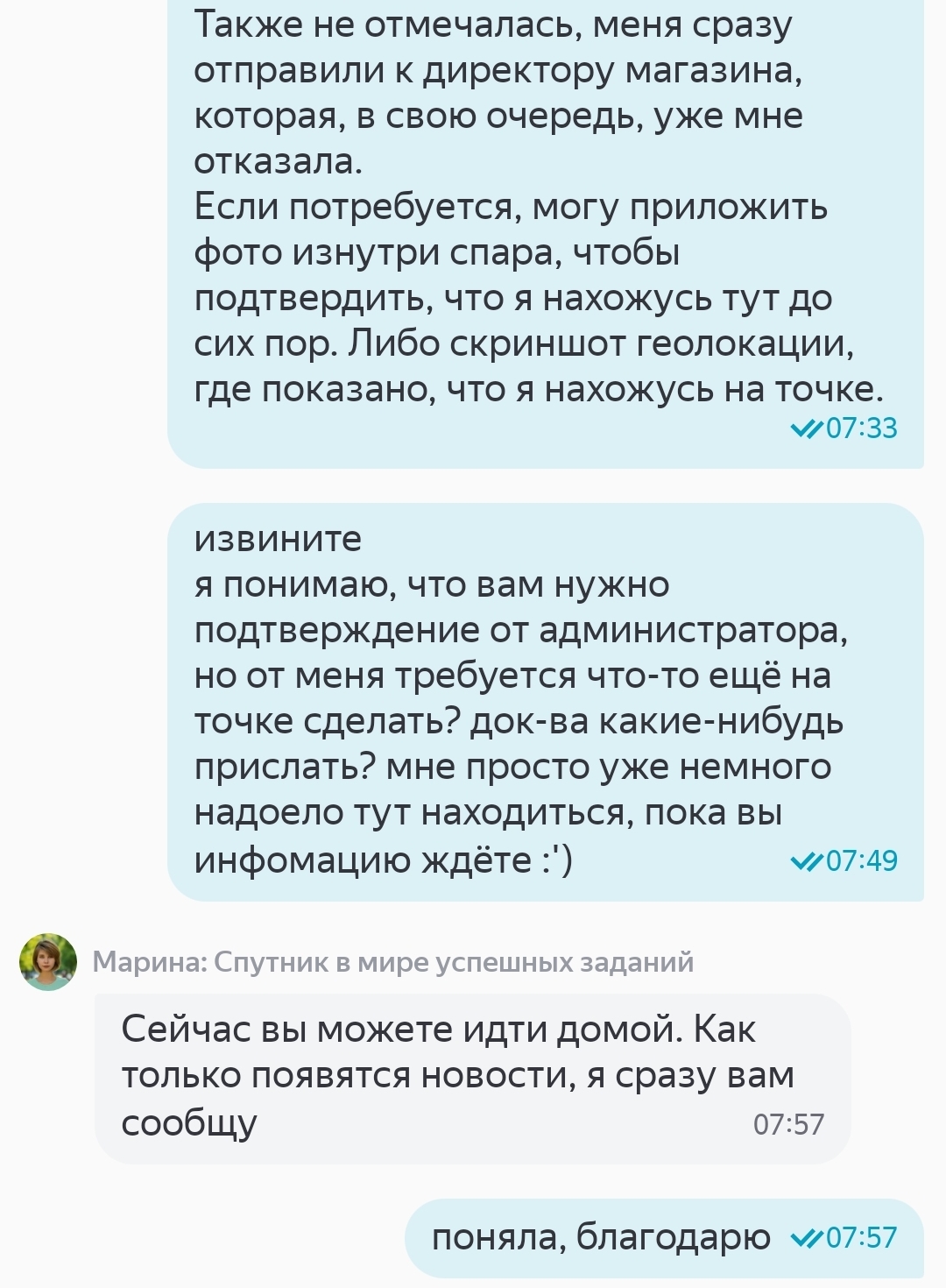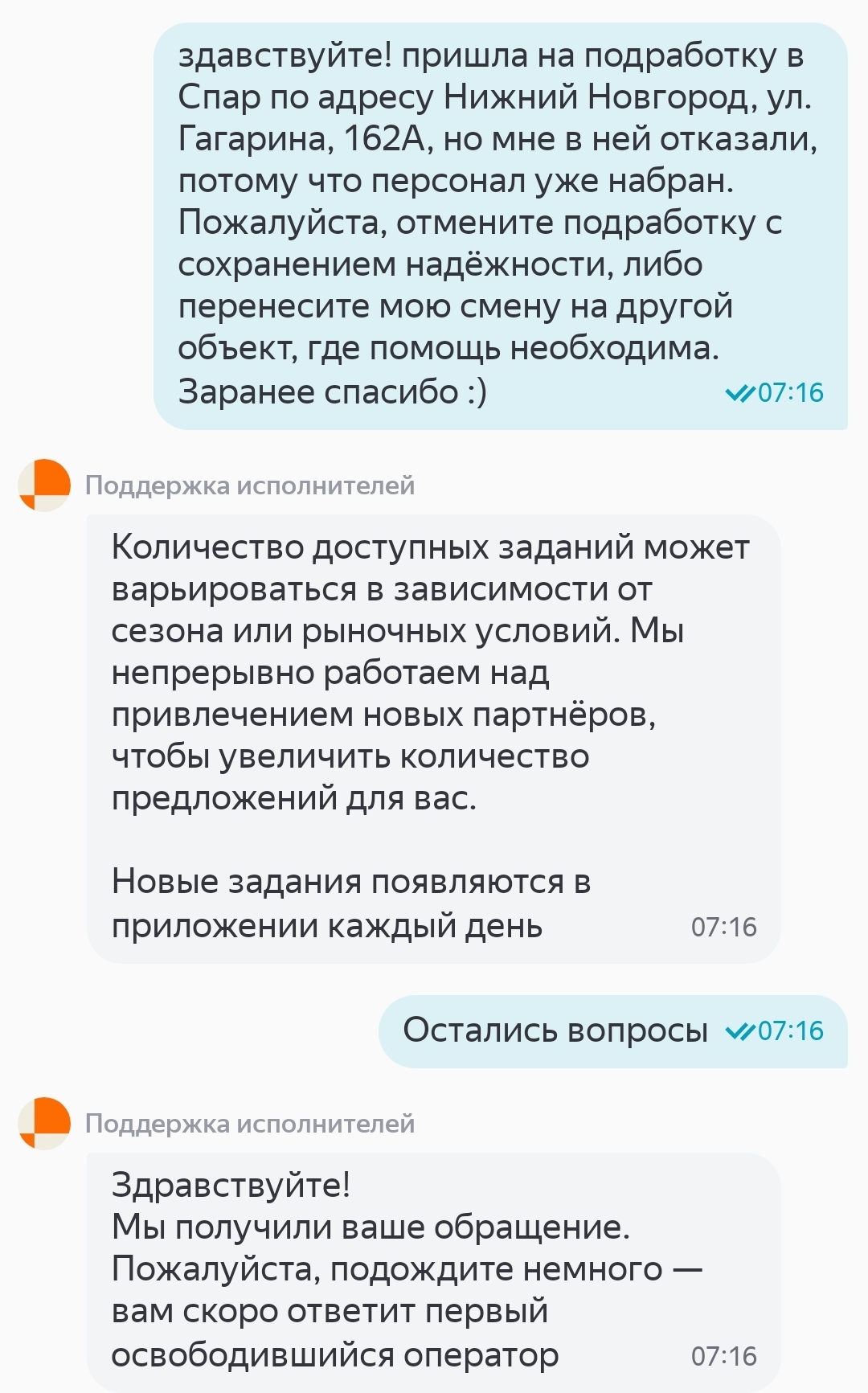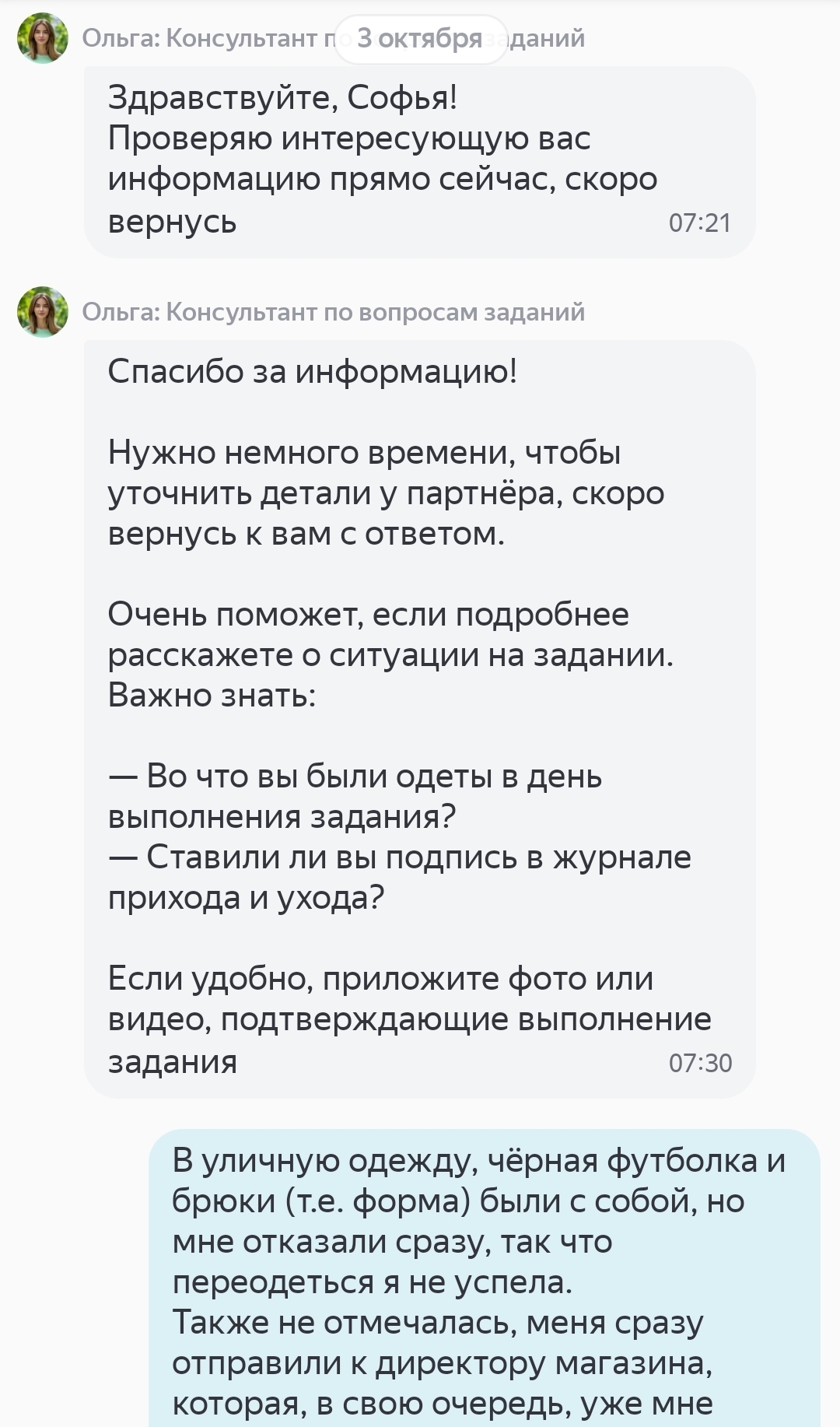 3.10. у меня стояла смена в магазине, на которую я пришла. Директор магазина отказала мне, потому что они уже нашли работника, и мои услуги им в тот день не требовались. Я, естественно, написала об этом в поддержку, чтобы они отменили мне задание с сохранением надëжность. Скриншот будет ниже.