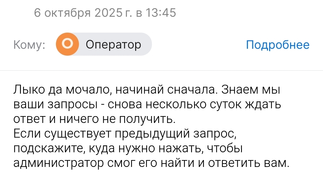 Единственный ответ, который удалось выбить: "попросите администратора написать в поддержку". Чтобы что? Чтобы еë там тоже фигурально послали на*уй? Удобный план, а главное на бумаге они по итогу никому ничего не должны.