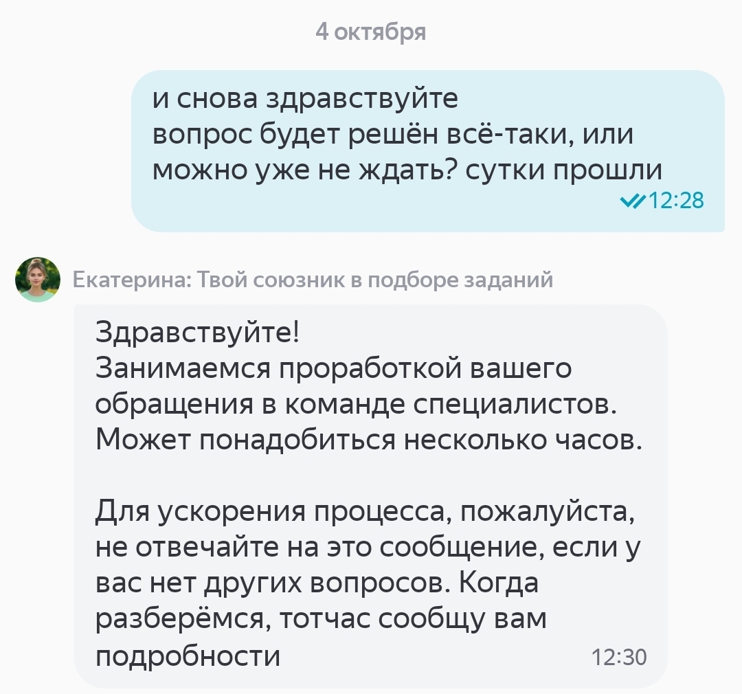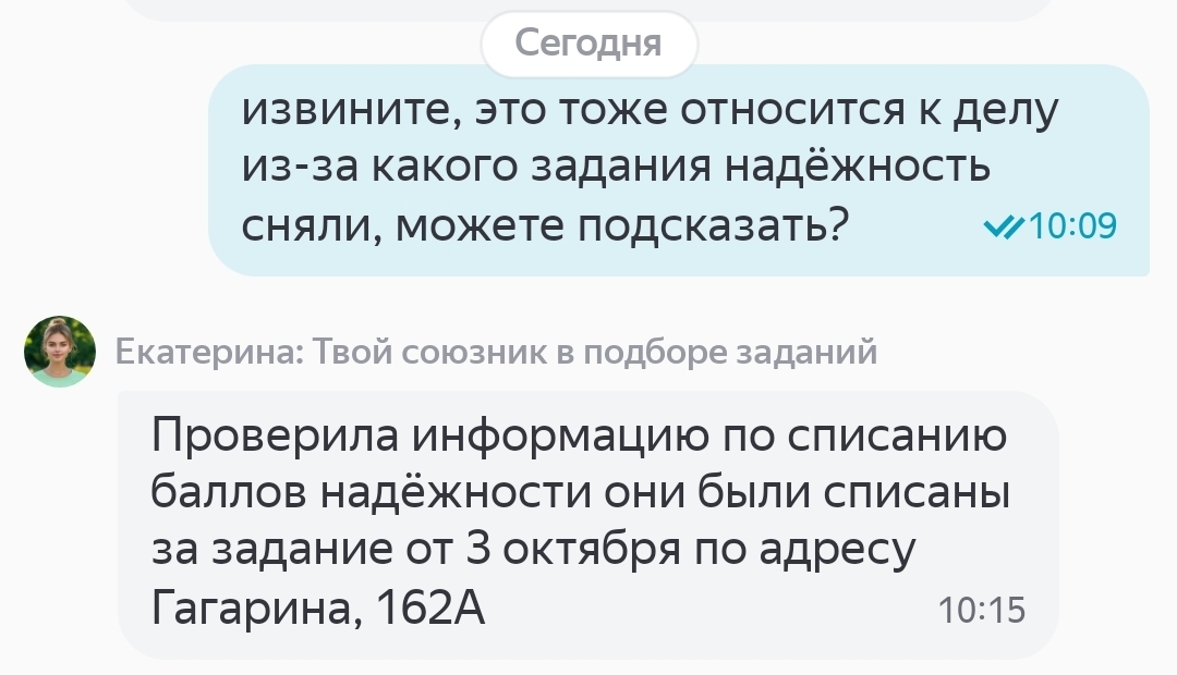 6.10. (т.е. сегодня) у меня была списана надëжность за невыход на задание, в следствии чего был заблокирован аккаунт. Ответ на вопрос, за какое задание она была снята, вы видите на экране. Напрашивается вполне логичный вывод, что за эти несколько дней никто моей просьбой не занимался. Я также поинтересовалась, можно ли через чат поддержки отправлять жалобы на работу сотрудников, но ответ на это не получила.