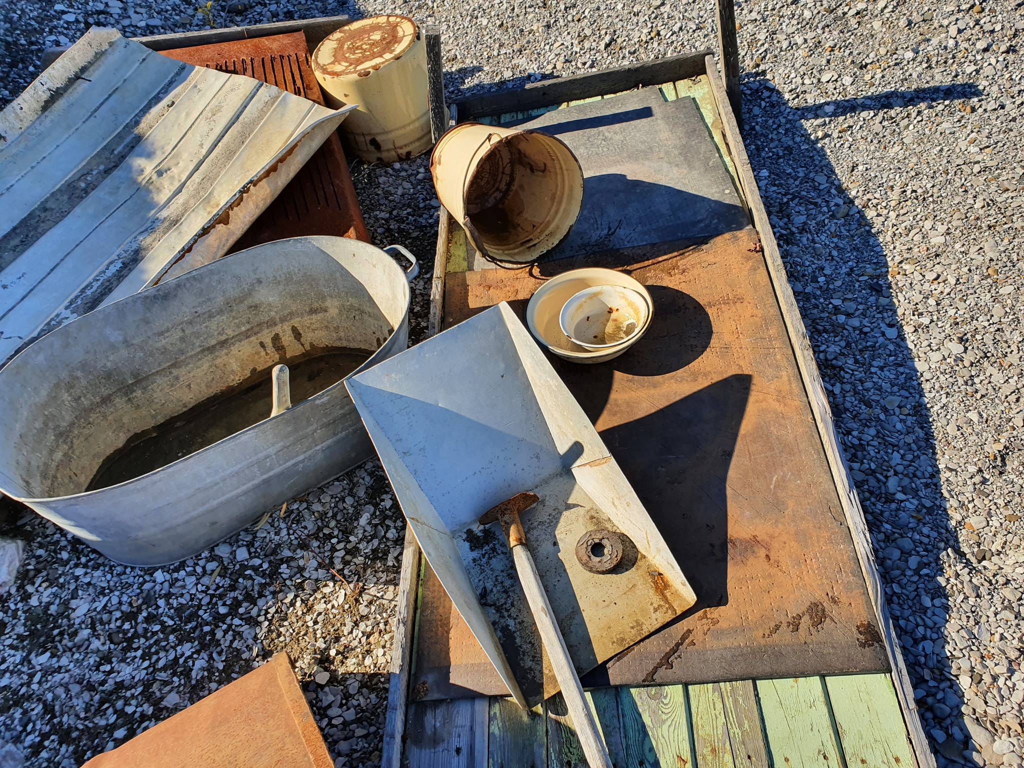 Опа, а что это у нас в уголке аккуратно сложено? Ведра-миски-тазики, алюминиевый желоб, импровизированный грохот из железного листа с щелевидной перфорацией (болгаркой поработали) и дражный коврик с квадратной ячеей. Коврик, пущенный в дело, явно со времен прииска, а все остальное самодельные инструменты старателя-одиночки уже более позднего времени, который, вероятно, пытался что-то добыть из тех самых хвостов ШОУ. Не буду называть неведомого старателя ни черным копателем, ни хищником. Пусть будет ИП занимающийся кустарной добычей (artisanal mining). Правовые основания его деятельности (или отсутствие таковых) пусть рассмотрит кто-нибудь другой ))) Мы разберем только технологию.