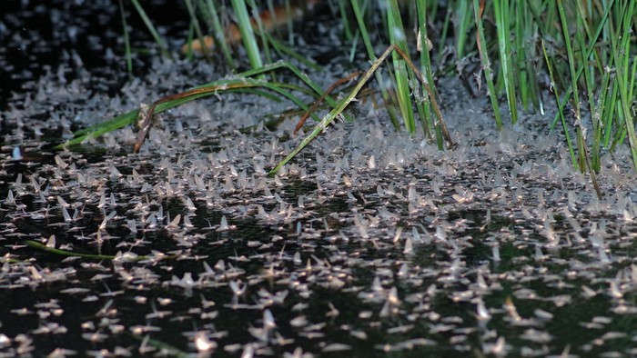 И после этого краткого экскурса в жизнь подёнок мне задали вопрос: а как же они успевают размножится за один день? Да очень просто: удачливые самцы находят самок, оплодотворяют их и тут же умирают. Да, так сказать, плохо кончают) А может и хорошо) А самки тут же после спаривания опускаются на или под поверхность водоёмов, откладывают там яйца и тоже погибают. После таких массовых вылетов водоемы, дороги, прилежащие конструкции - всё покрыто тысячами тел этих насекомых, которые живут лишь день.