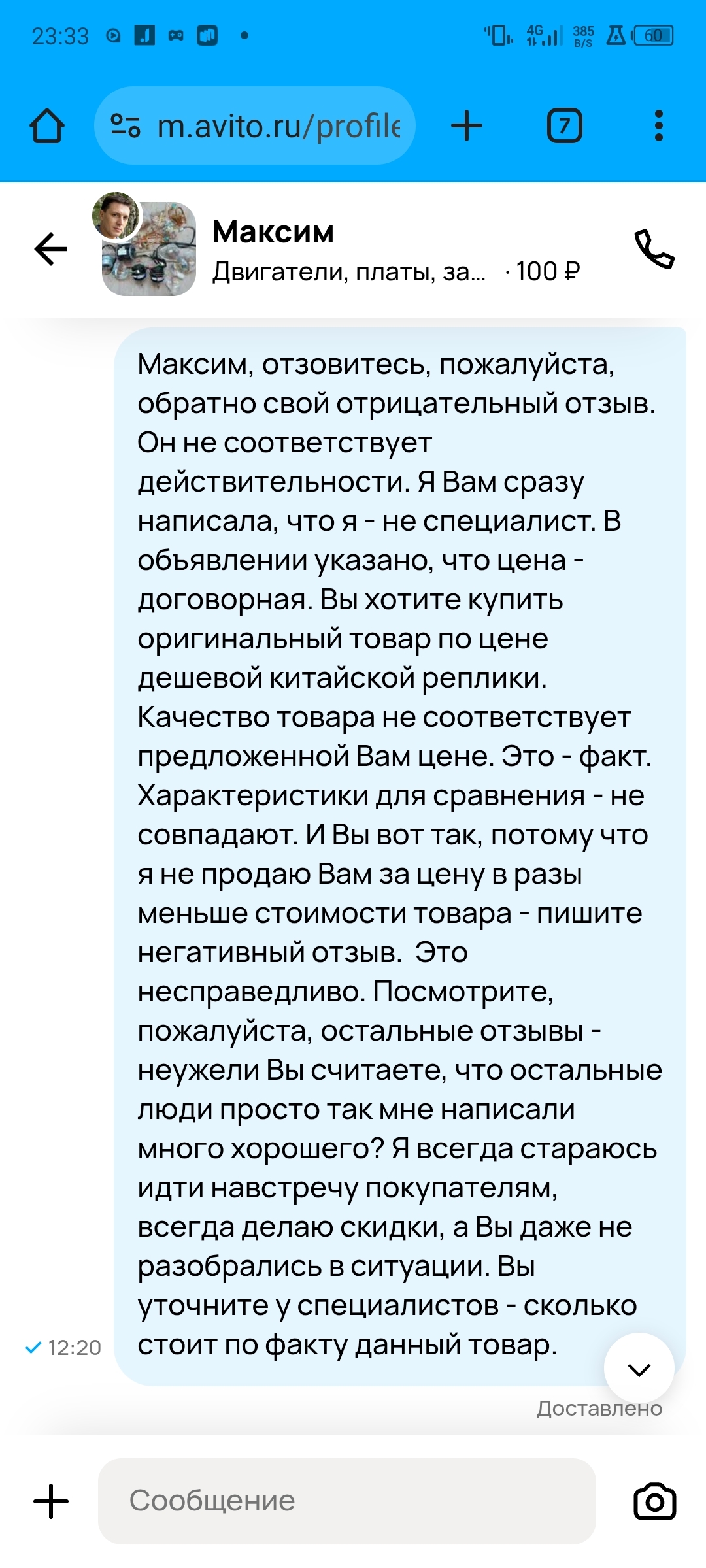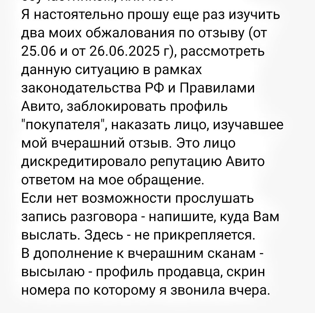 На следующий день пишу повторное обжалование на Авито: