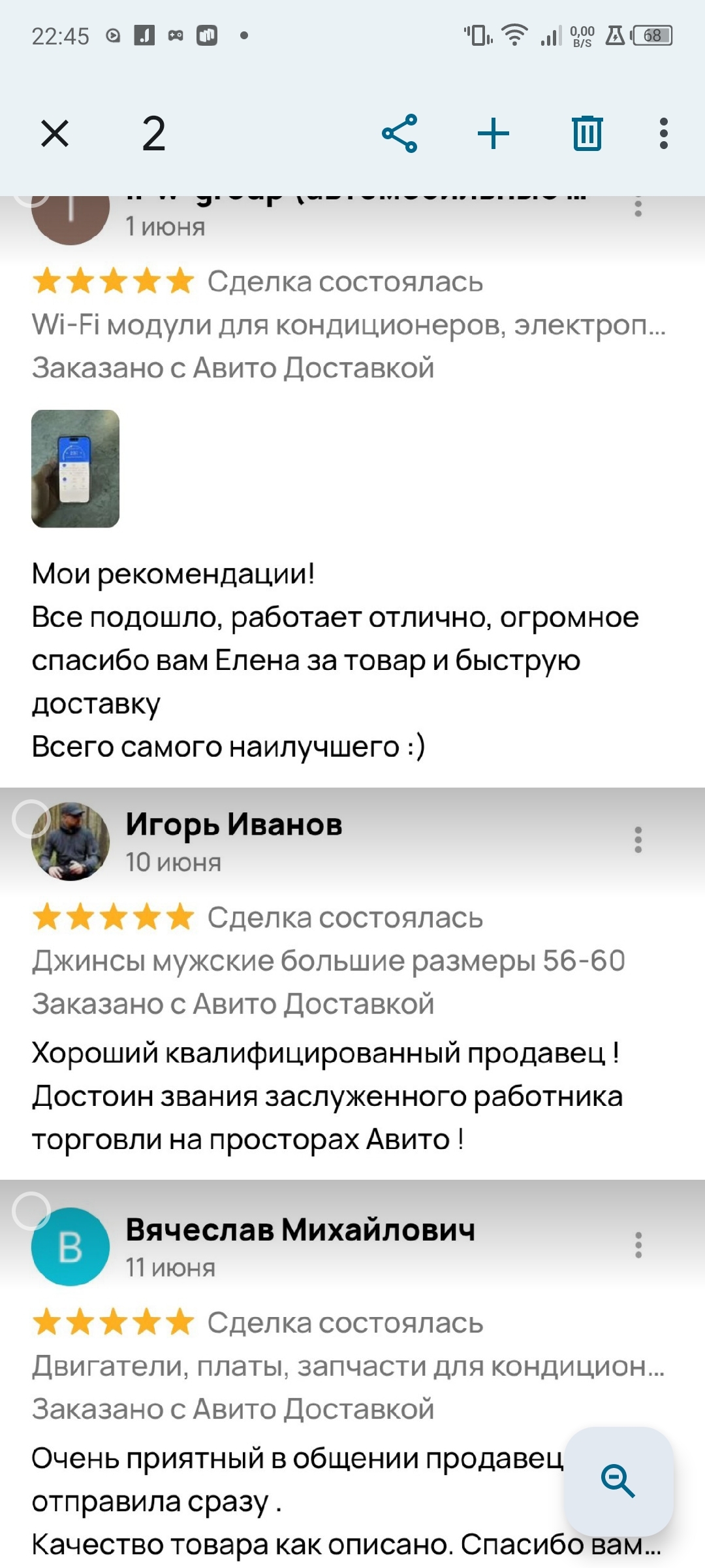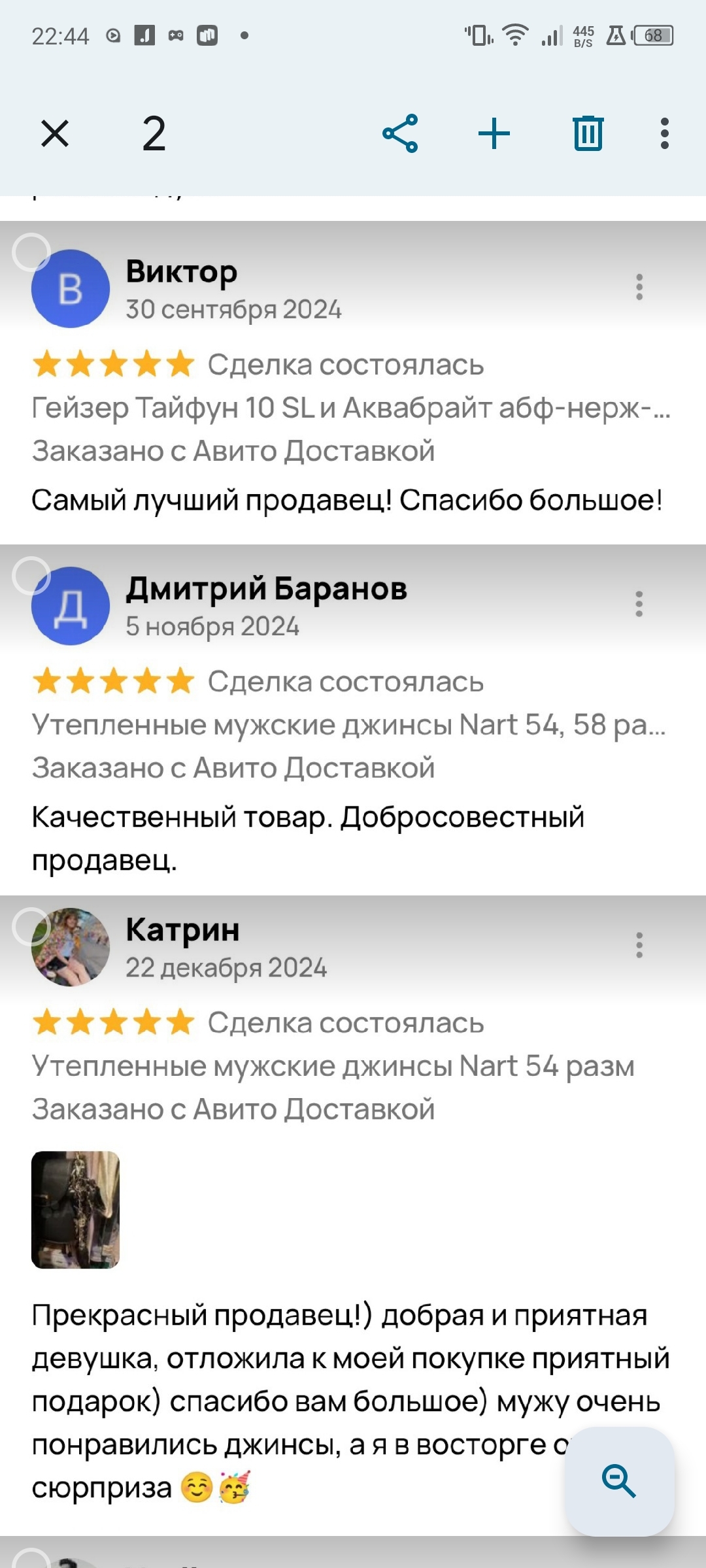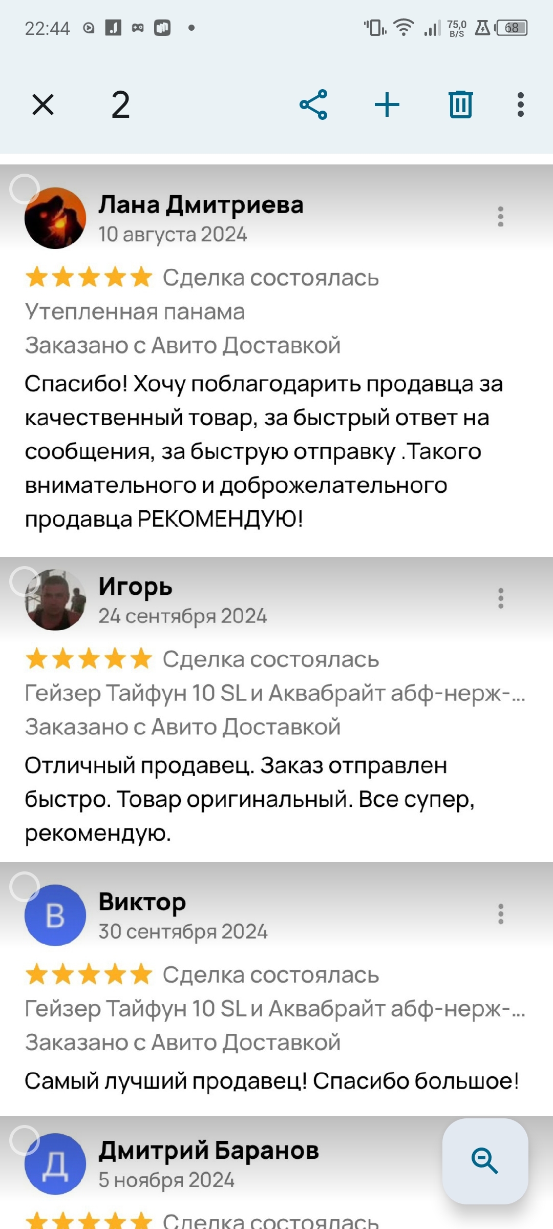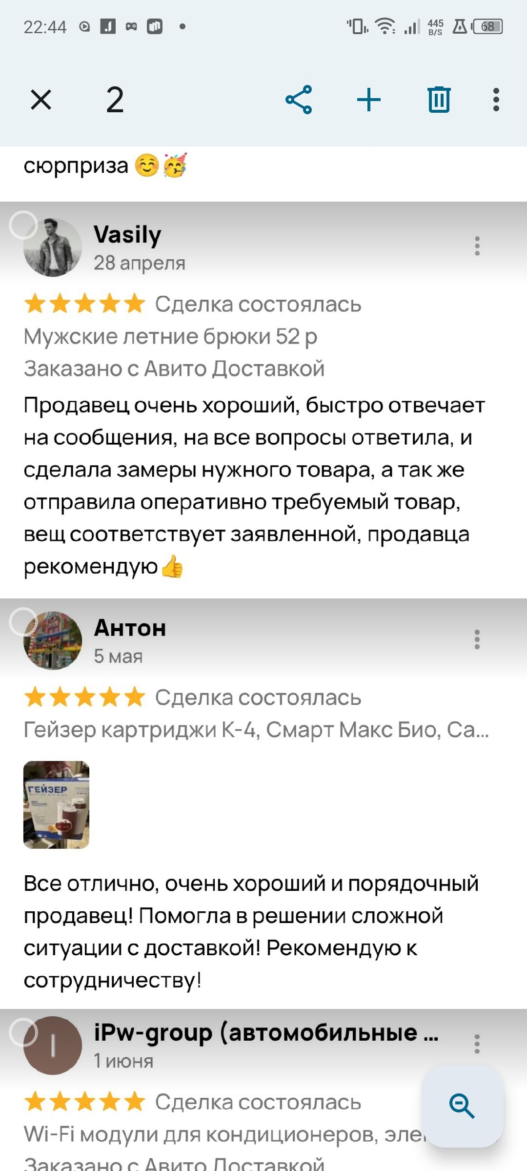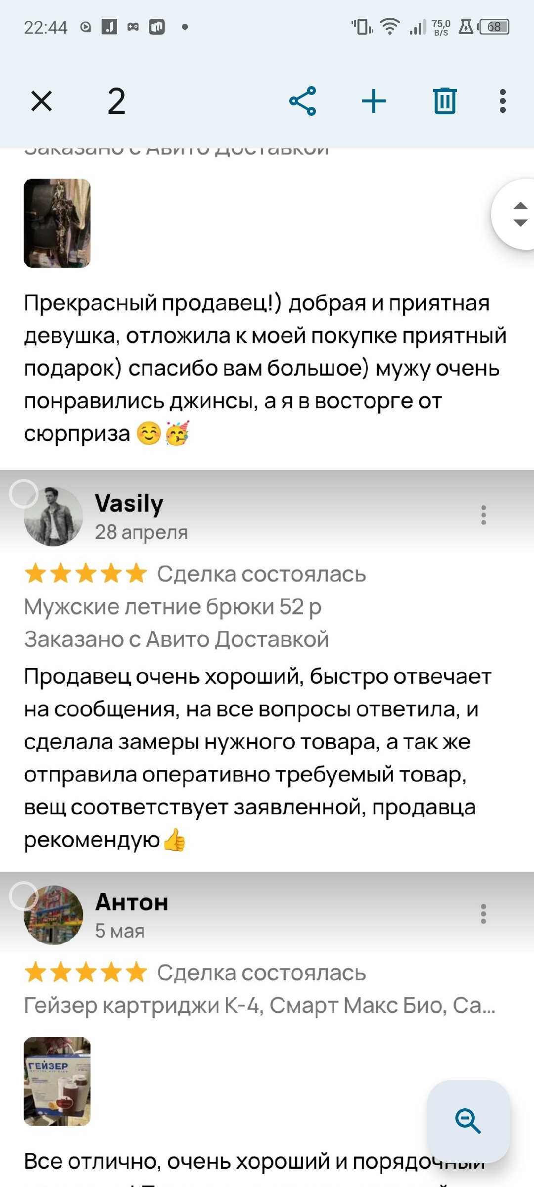 Продаю потихоньку на Авито. Далеко не первый год. С каждым покупателем замечательно общаюсь. У меня на сегодня 54 отзыва с оценкой "5" И 1 отзыв с оценкой "1". Вот примеры отзывов обо мне.