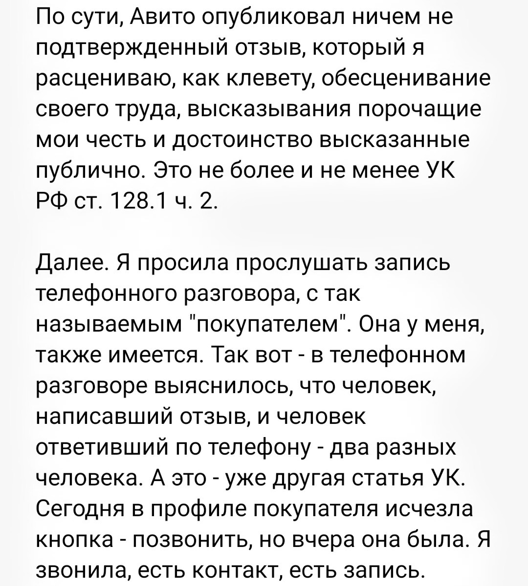 Тишина... Ладно. Вижу, что " продавцу" можно позвонить через Авито. Звоню. И в разговоре узнаю, что человек, который писал отзыв, использует номер другого человека - своего друга. И его друг, с которым я общаюсь по телефону, не имеет никакого отношения к данной ситуации. Я прошу друга передать мою просьбу об удалении отзыва и ещё раз объясняю ситуацию. Разговор записываю.