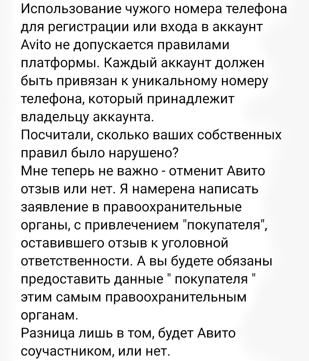 Понимаю и осознаю, что будет непросто, но, ребята, честное слово - нужно это прекратить! Мой случай - не единственный. Сколько пострадавших от вот таких отзывов, сколько у людей потрачено нервов, здоровья, времени и сил на борьбу с беспределом на Авито.