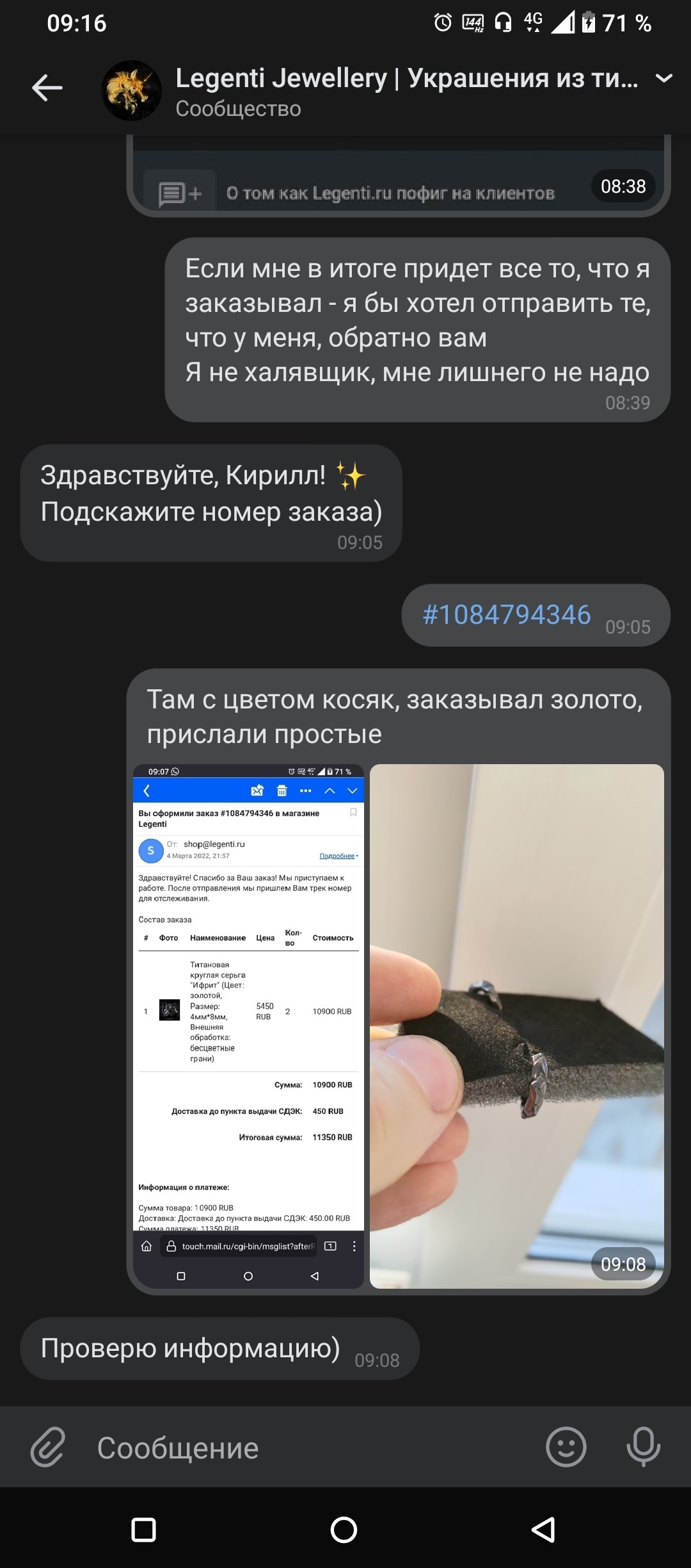 решил и себя порадовать их изделием, и заказать серьги. Естественно перед этим прочитав все их темы в ВК - начал задавать вопросы о товаре, где мне уже стоило насторожиться тем, что поддержка читала мои вопросы по диагонали, и отвечала будто не на них, а на какие то свои: