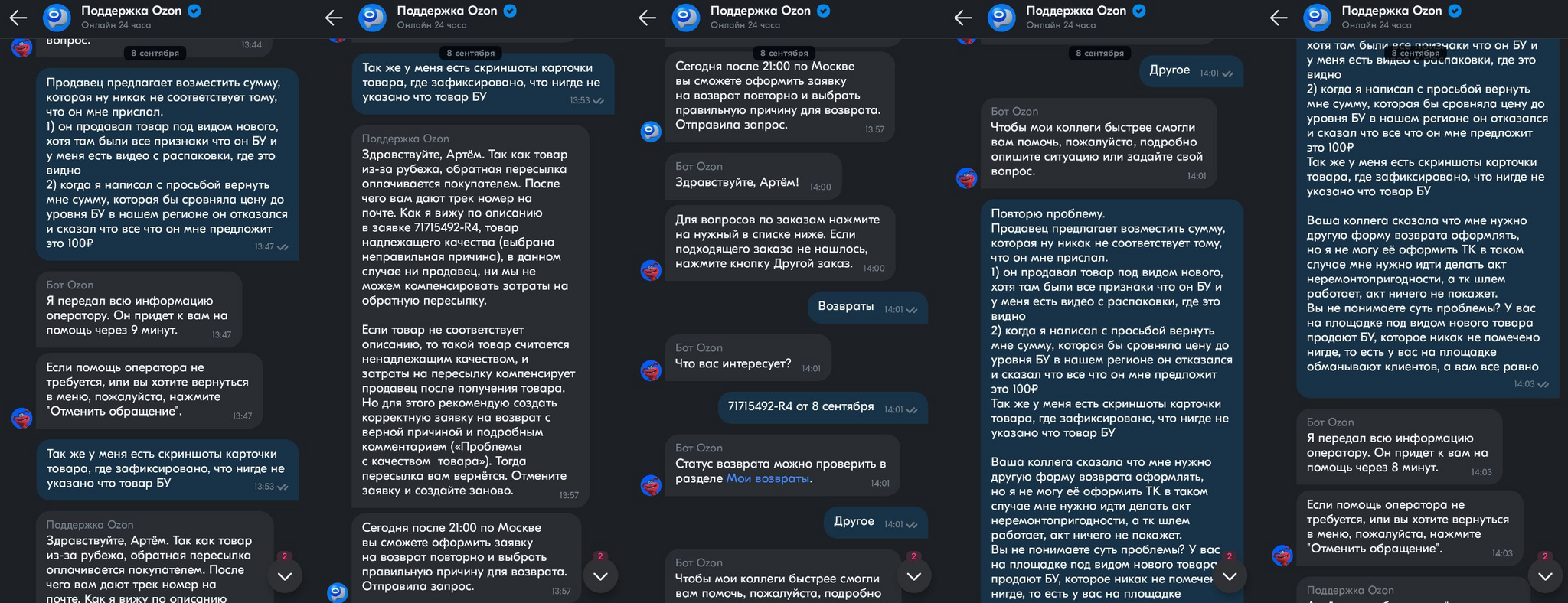 Почему я не хочу отправлять товар обратно, было описано в последнем диалоге с поддержкой OZON. Просто не имеет смысла мне менять использованное шило на на такое же использованное шило, только уже с доплатой.
