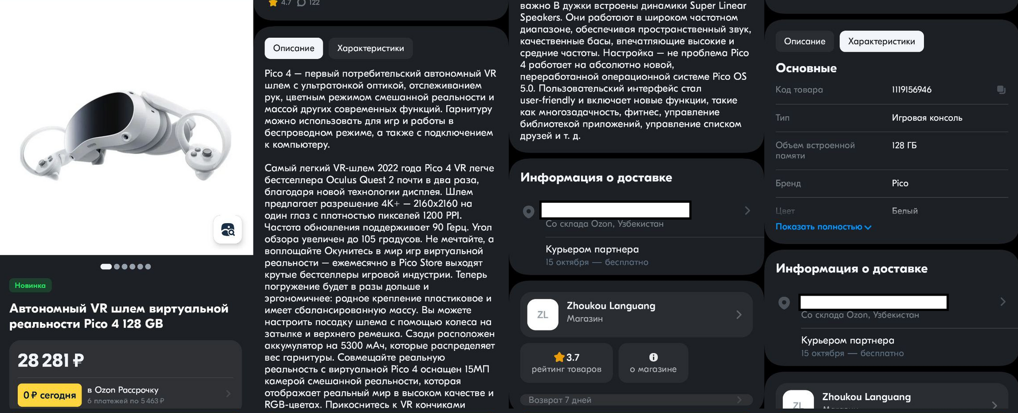 Я увлекаюсь виртуальной реальностью и решил обзавестись очередным шлемом, в частности Pico 4. На ozon global была очень выгодная цена на этот шлем и я решил его заказать. Я убедился, что в описании и характеристиках всё указано верно и соответствовало реальному описанию товара. Нигде не было указано, что товар БУ. Заказ сделан, шлем отправился ко мне.