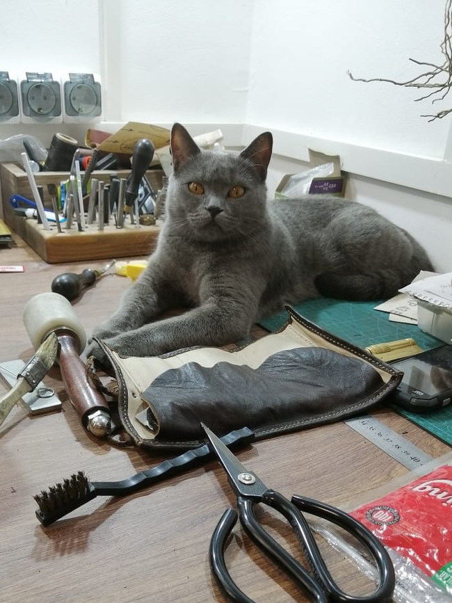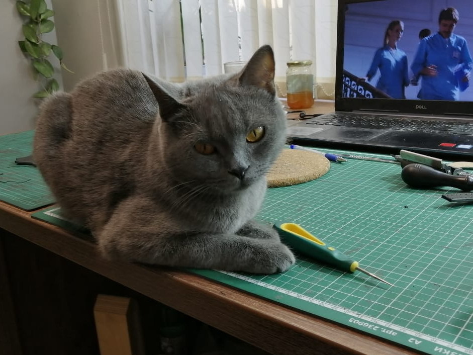 Дома моя кошка эту британку обшипела и попыталась устроить драку, но я их успела растащить. Поэтому приютилась найденная британка у меня в мастерской. Освоилась и стала помогать мне работать. Мух ловила и вообще следила, чтобы все было чинно. Лоток освоила молниеносно. И при этом была очень ласковая, как-то так особенно трепетно муркалась. Как будто понимала, что после того как ее выбросили её люди, она получила второй шанс от судьбы.