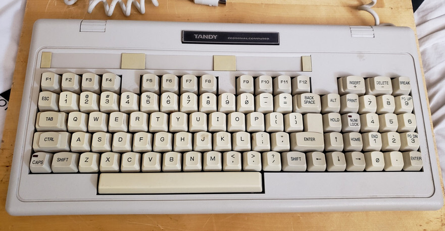 Клавиатура — «It's cyrillic — no problem». Выглядит один в один как клавиатура Tandy 1000, только с русскими буквами. И ещё ощущение, что они кнопку «З» вверх ногами воткнули.
