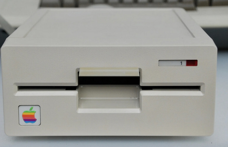 В какой-то момент коробочка для дискет исчезает и рядышком с компом появляется дисковод. Вроде как от Apple.
