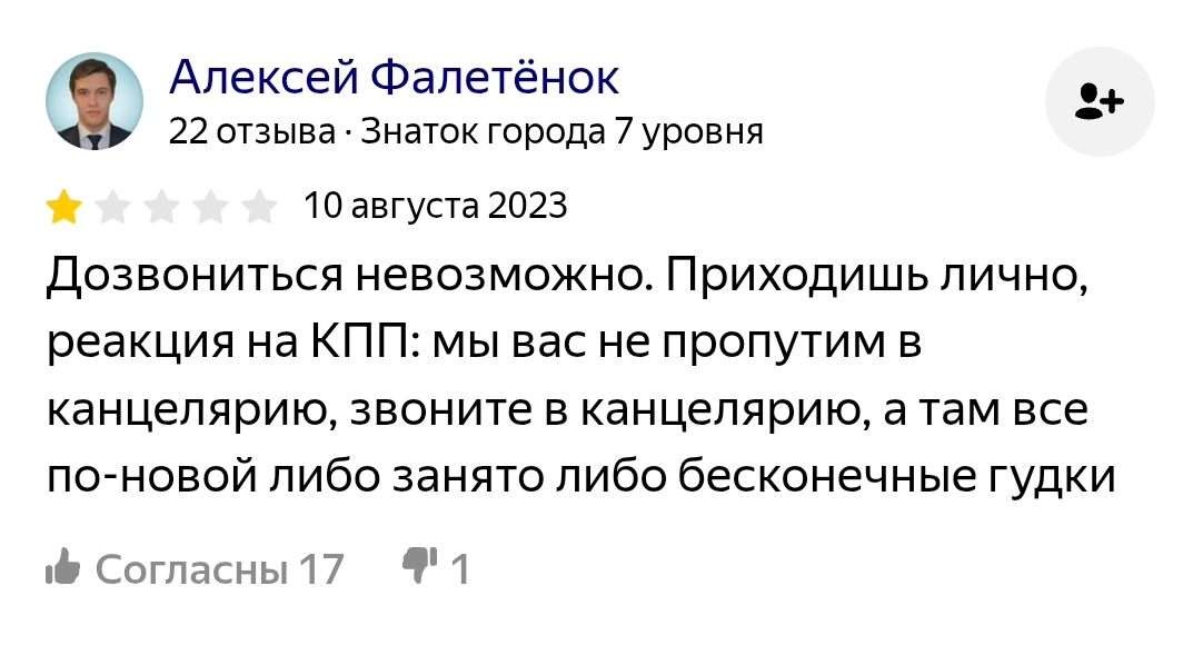 Что интересно, если позвонить по номеру телефона прокуратуры того же района, что и МВД, то после 16:30 можно наткнуться на сообщение: "Телефон вызываемого абонента выключен или больше не обслуживается." Вот так вот. А время работы до 17:00. Да и в целом, звонить в прокуратуру и говорить, что секретариат не работает, страшно, учитывая, что по тем же отзывам яндекса, которым теперь начинаешь верить чуть больше, прокуратура сильно крышует МВД (как бы смешно это не звучало) и все заявления топит ещё на их подаче.