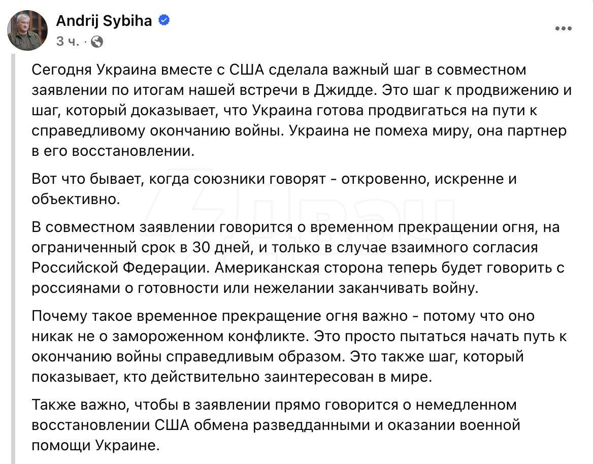 На своей личной страничке Фейсбук (запрещённая соц сеть в РФ) глава МИД Украины, Андрей Сибига, описал свои мысли о прошедшей пару часов назад встречи украинской и американской делигации в саудовской Аравии. (Пруф - https://www.facebook.com/100050711722604/posts/1183688616664...)